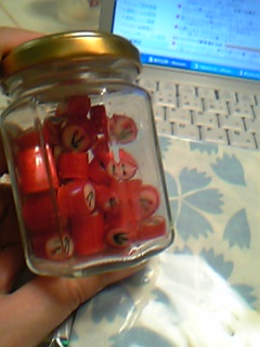 仕事から帰り、郵便受けを覗くと朱鷺生さんからお手紙が届いてました。遅くなって腹ペコのjunjunに怒られながらも開封。中からとっても可愛いカードとさくらんぼのキャンディとなでしこ(あじさい?)の花の模様の手ぬぐいハンカチ(タグにはふきんって書いてあったけどもったいなすぎ~)カードにはお誕生日おめでとうの言葉まで添えていただいて、昨日、すごく凹んでたんだけど(凹んでたから?)、すごくうれしくって、元気になりました。キャンディをさっそくjunjunと一粒ずつ食べてみた。おいし~。よくあるこういうのは甘いだけだたりするんだけど、ちゃんとねサクランボ味なの♪チョビチョビ食べようと空き瓶に入れた。うふふ。かわいい(*^_^*)朱鷺生さんからはこのキャンディをクリスマスにもいただいた。朱鷺生さんのこういう細かな心配りとかわいらしいサプライズ作りの茶目っ気はとっても素敵だな~って思う。私は、いろいろ思ってもなかなか行動に移せなくって時期を逃してしまう。思い立ったが吉日!!をモットーにがんばろっかな。(この「っかな」が怪しいなぁ・爆)朱鷺生さん、本当にありがとうございました。