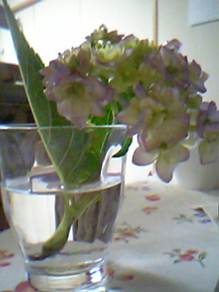 実家の庭先から紫陽花の花を一枝、手折ってきました。八重の紫陽花白に紫の縁取りの花びら。まだまだつぼみがいっぱい。でも紫陽花って水揚げが難しい。茎の根元を火であぶってみたけど、どうかな。明日の朝も元気に咲いていて欲しいな。でないとばあちゃんに叱られちゃうよ。