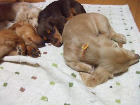 今日は業者さんも来ないし、特に急ぎの仕事もなかったので、チビッ子達を病院に連れて行くため、ほぼ定時退社です。通勤に45分くらいかかるので、病院にギリギリ。大急ぎで、またまた4ワンをロトのキャリーバッグにつめて病院へ。無事2回目のワクチンをしてきました。病院でも大きくなったね~って可愛がっていただきました。そうそう。病院でも名前を言うと、一瞬クスって笑われるんだけど、すぐどの子がどの子かわかってもらえるので、とっても便利♪でしたよ(笑)帰ってきて、ご飯を食べたら、みんなでおねんね。久々に4ワンまとめて撮れました♪やっぱりアイボおっきい?病院で体重を量るとアイボが3.2kgベージュが2.8kgホワイトとチョコが2.75kgでした。やっぱりアイボ大きいね~。だって、Seiは4.5kgだからね。あ、ロトは6kgくらいありますけどね。2回目のワクチンを打ったので、2週間くらい経つとお散歩に行けます。これで、ちょっと安心かな。フィラリアの薬は、どうしようかな。今週末くらいから始めた方がいいんだけど、今からかかる病院でもらった方がいいかな・・・と思ったり、蚊の多い季節だから、ちょっとでも早い方がいいかな?と思ったり。受け渡しの日次第かな。ワンコの健康第一だもんね。チビッ子達が寝てる頃、パパママは・・・・なぜか、Seiがキャリーバッグに入って寝てました(笑)
