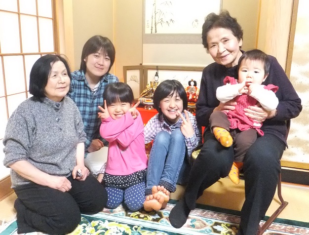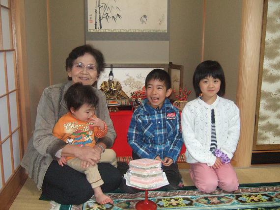 午後から母が来訪し、惟央の初節句を御祝いしてくれました。菱餅を作って持ってきてくれました。まだ柔らかくて、子供たちは端っこのほうをつまみ食いしていました。そして、はしゃいで喜んでいました。みんなでひなまつりの歌を歌うと、気分もすっかりひな祭り!女子ばかりそろって写真を撮りました。
