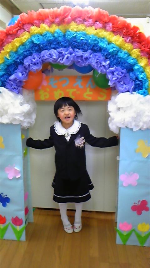 卒園式がありました。6年間保育園に通ったので、母もちょっと感動です。カメラ撮影禁止だったので、式自体は写真を撮ることができませんでしたが、心のフィルムにばっちりおさめました。(写真屋さんがビデオ撮りしたものを、後日見ることができるそうです。)式のあと、一生懸命準備してきた保護者主催の謝恩会がありました。がんばって作ったアーチや飾りなど、子供たち喜んでくれてよかったです。先生方も喜んで参加してくださって、結構充実した謝恩会となりました。子供たちが歌ってくれた「YEAL」や踊ってくれた「じょいふる」もなかなか見ていて楽しかったし、お母さんたちが歌った「ひまわり」も、自然発生的に子供たちが一緒に歌ってくれてよかったです。違う小学校に行くお友達もいて、お別れしないといけない子も沢山いるので、こういう場を設定して子供も大人も触れ合えたことは、意味のあることだなあと感じました。