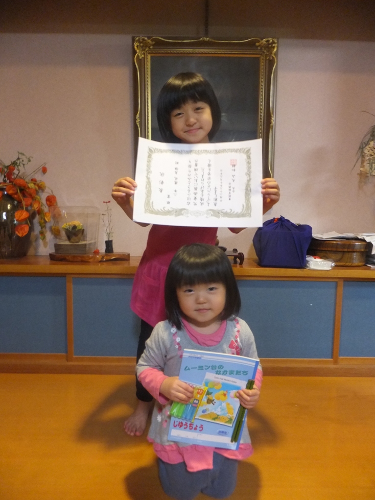 久々に書いています。仕事も忙しく、なかなかこの画面に向かえず・・・。 子どもたちはその間もすくすくと成長しています。 姉の真惟は夏休みに描いた絵が銀賞に入って大喜び。絵を描くことが好きなので、賞に入れえてもらってよかったです。お勉強も・・・がんばれ~ (^o^) 妹の由惟は、「早くお正月きないかな~。」(こないかな~と言えない)と、お正月に着物を着ることを夢見ている毎日。 先日、延び延びにしていた予防接種を、お医者さんに勧められ一気に3本うったら、太ももが2倍くらいふくれあがり、熱を持って3日ほどはぱんぱんでした。よくあるそうですが、新聞であがったことのある予防接種だったので、冷や冷やでした。 最近は秋らしく、朝晩はよく冷えるようになってきました。紅葉も山の方では、ちらほら色づいてきている模様。まだ、日中は暑いくらいなので、体調を崩さないよう、健康管理に気をつけたいところです。 明日は、祖父母が子どもたちをつれて日帰りで温泉に行く予定。父母は仕事なので、一緒には行けないかな。父は行けるかも??まだ、帰宅していないから、未定ですが・・・。 近々、家族そろって紅葉を見に行けるといいなあ。