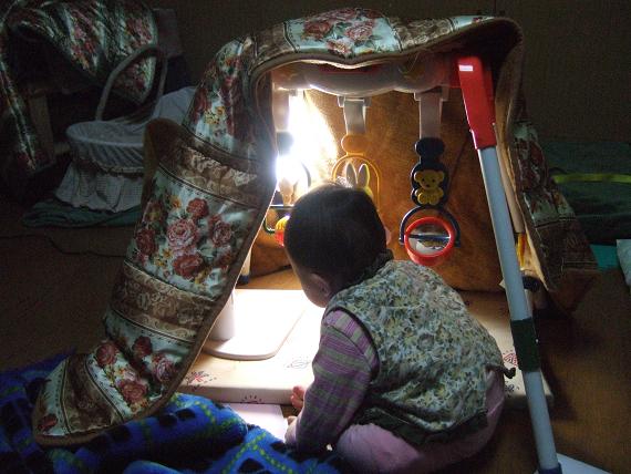 スイミングベビースイミングに行きました。先週は、由惟の鼻水がまだ出ていたのでお休みしたのでした。久々だったためか、あるいは眠かったためか、ごきげんななめで泣き通しでした。しかも、母にぴったりくっついて まさに「抱っこちゃん人形」状態。来週は少しはみんなと活動できるかなあ。おうちづくり真惟は布団やアイロン台や電気スタンド、クーハンなどを使って「おうち」を作る!と言って何やらごそごそしています。完成したおうちを由惟がのぞきにきました。