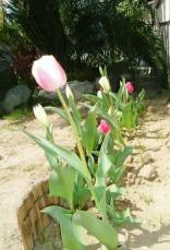 病院の敷地内ね。今日は眼科でしたよ。眼科はちかれるよ。めぇみえない。けど、でじかめのレンズが撮ってくれた。桜がいっぱい咲いてたから、よく見えなかったけど、撮っておこうと思ってね。目に薬さしてたから、よけいに見えなくってさ。でも最近はもう動的視野検査ってのやんないから、とってもいいよ。あれね、わたしには、拷問だったよ。パラボラアンテナみたいなところに、顔当てて、暗くして、片目を隠して、1点の光を見ながら、やってくるもう1つの光をキャッチできたら知らせるやつ。右目は全然OKだけどさ、左眼は1点の光を集中して見ておくなんて、そんなことできませんわよ。視神経に邪魔物があるだで。あれは辛かったなぁ。でもあの検査はもうやんないからいいや。それにしても、眼科は疲れる。先生は女医さんでおもしろいよ。今日もね、ひゃははは、ひゃはははって笑ってた。3ヶ月前につくったプラズマレンズのメガネの調子の話なんかしてね。あれ、いいよ。 プラズマレンズの日記はここねメガネ屋さんに処方箋を持っていってつくるの面倒で、ここ(大学病院出入りの人)で頼んだのね。10個くらいしか、ない商品の中から、30秒くらいで、これでいいって選んだんだけどね、フレーム。けっこう素敵。あとでよく見たら、マックスマーラだったよ。わたしって、なかなかセンスいいじゃん。おほほほ・・値段もふつうだったわ。うちに帰って庭を見たら、チューリップがいくつも咲いてた。それから、焼却炉の陰にこんな花が咲いてた。 掲示板◆脳腫瘍患者の広場◆は (^^)rこちらから