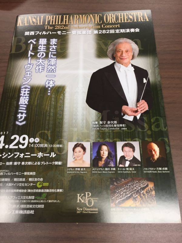 晴れ渡る空、ゴールデンウィークが始まりました。 やって来たのは飯守泰次郎指揮、ベートーヴェンの荘厳ミサの定期演奏会。 珍しく先月に続き飯守さんの登場となりました。合唱団にもオーケストラにもとっても厳しい練習の日々でした。私はまたもや書き込みだらけの作業をこなしてどうなることかと思いました。今、無事に演奏会を終えてほっとしています。ソリストの皆さんも素晴らしかったし合唱団もよく練習したのだと思いました。ほんと、難しい曲です。この手の楽曲は私も大変でボウイング付けが嫌になってきます。今回は付けてあったのでそれだけでもほっとしてのスタートでした。 天気にも恵まれ素敵な一日となりました。 本日ご来場下さいました皆様に心より御礼申し上げます。また、ゴールデンウィークをお楽しみください。