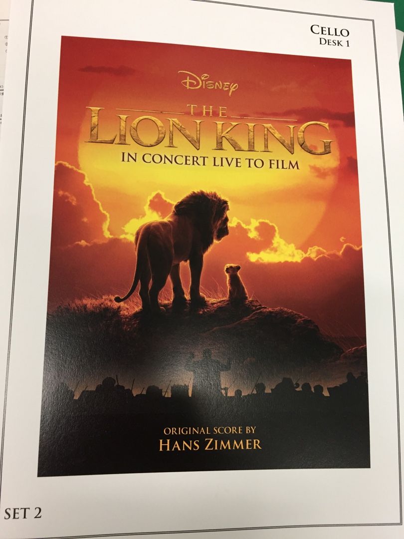 フェスティバルホールにてライオンキング公演でした。 これは映画に合わせてオーケストラが演奏して楽しんでいただくものです。 公開が8月頭とあってまだまだいろんな問題があって楽譜ができたのもついこの間でした。 もちろん、ディズニーから送られてきました。 こちらは時間との戦い! 楽譜をぱ~~~っと開けてボウイングを書いてもらう段取りが・・・印刷のものが ついていました。 なんてありがたいことか。 前回の美女と野獣は全部書いたのを思い出しました。 ほっとして昨日を終えました。 楽譜の表紙もさすがです。