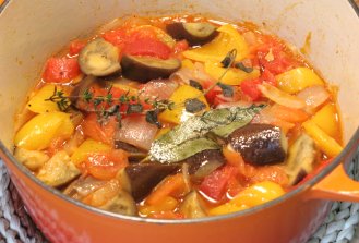 近所のスーパーにはズッキーニが売ってなかったので(使う予定がないときは売っている^-^;)、玉ねぎ・トマト・ナス・黄色のパプリカで。