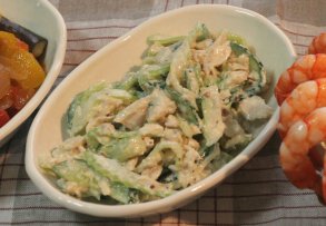 ゆで鶏と、セロリ・キュウリのスライスをマヨネーズ+粒マスタード+スープストックで和えて、塩胡椒で調えただけ。