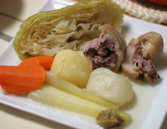 ニンジンやタマネギと数時間煮た後に骨をはずし、空いたスペースにキャベツとセロリとジャガイモを追加。