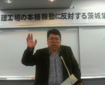 水戸市の茨城自治労会館で行われた止めよう再処理茨城県集会で、六ヵ所再処理工場の危険性を訴える核燃料サイクル阻止1万人訴訟原告団事務局長の山田清彦さんです。