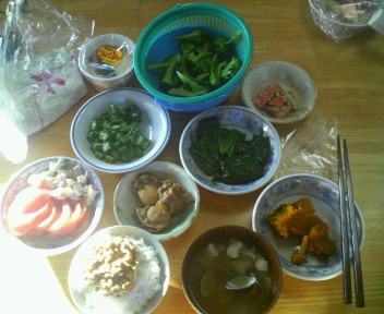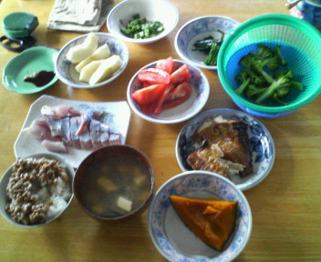昨日の昼食は実家です。納豆ご飯、蜆味噌汁、フクラゲ刺身、鰈塩焼き、カボチャ、ブロッコリ、ほうれん草、オクラ、リンゴです。