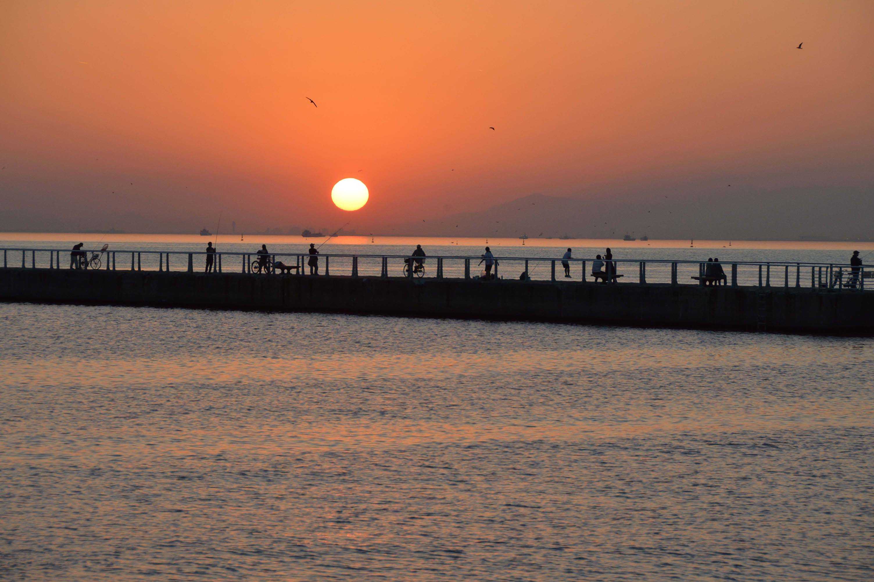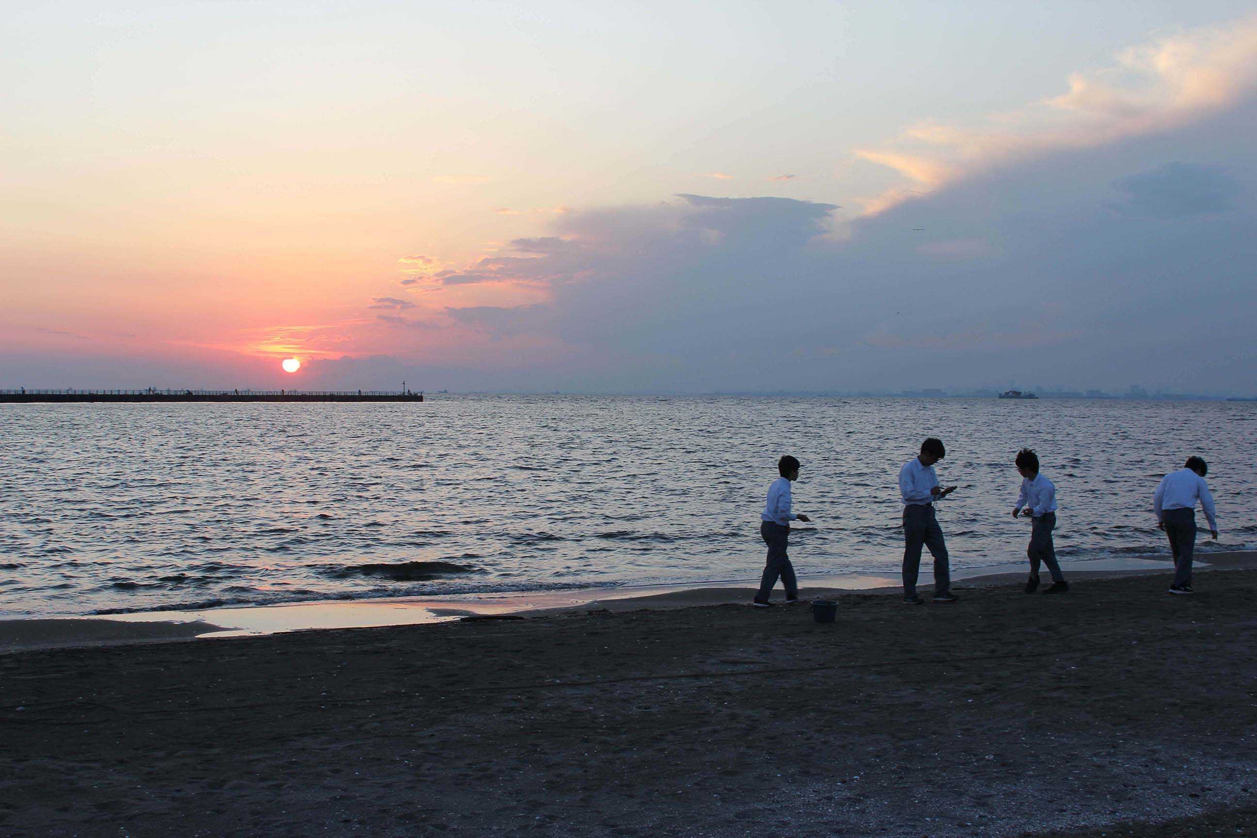 自宅から空を見上げ、夕陽が出ていることを確かめてから東京湾を目指して自転車を漕いで行きます。10分もすると千葉マリンスタジアムの脇に到着し、海を見ながら太陽の具合を観察します。美浜大橋を超えると幕張の浜に着き、ここを今日の夕陽の撮影場所と決めました。ここでカメラをカバンから取り出し、夕陽の落ち具合を見ながら露出を決めてテスト撮りを開始します。手前の防波堤には釣り人や夕陽を見に来る人たちが居るので、夕陽の落ち際に上手く人物が配置出来るかを祈るばかりです。空に鳥の群れが来れば良いのですが、渡り鳥の到来の季節がまだ先なので飛行機でも飛んで来ないかなどと考えているとあっという間に太陽が沈みます。