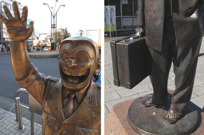 この数年の間に都内の大半の個人商店が日曜日を休むようになってしまったために人出も少なく、商店街は閑散としており、私が歩く下町の商店街は殆どがシャッターを閉めている。ところが観光客相手の商店街は逆に日曜日が書入れ時で人出に溢れて活気を帯びる。そんな訳で今日は京成電車を高砂で下車して人出の多い柴又に向かって歩き始めた。昭和30年代の始め、未だ家庭にテレビが無い頃にパーツを集めて白黒テレビを組み立てて力道山のプロレスに熱中した頃、それを組み立てた名人がこの界隈に住んでいたので未だ健在ならお礼を言いたいなあと懐かしく昔を思い出した。柴又に着くと駅前にはすっかりお馴染みになった寅さんのブロンズ像の前で記念写真を撮る観光客が大勢いた。小休止の定番「高木屋老舗」の草団子300円也。コーヒー一杯に500円払うならお茶と団子で300円は安い。お茶を二杯飲んだところで、寅さんに会ったなら葛飾のもう一人の有名人の両さんに会うためにこれから金町経由亀有まで歩くこととした。金町の駅前商店街は閑散としており、亀有は比較的人出が多くて両さんが手を挙げて迎えてくれた。風も無く穏やかな日曜日でした。