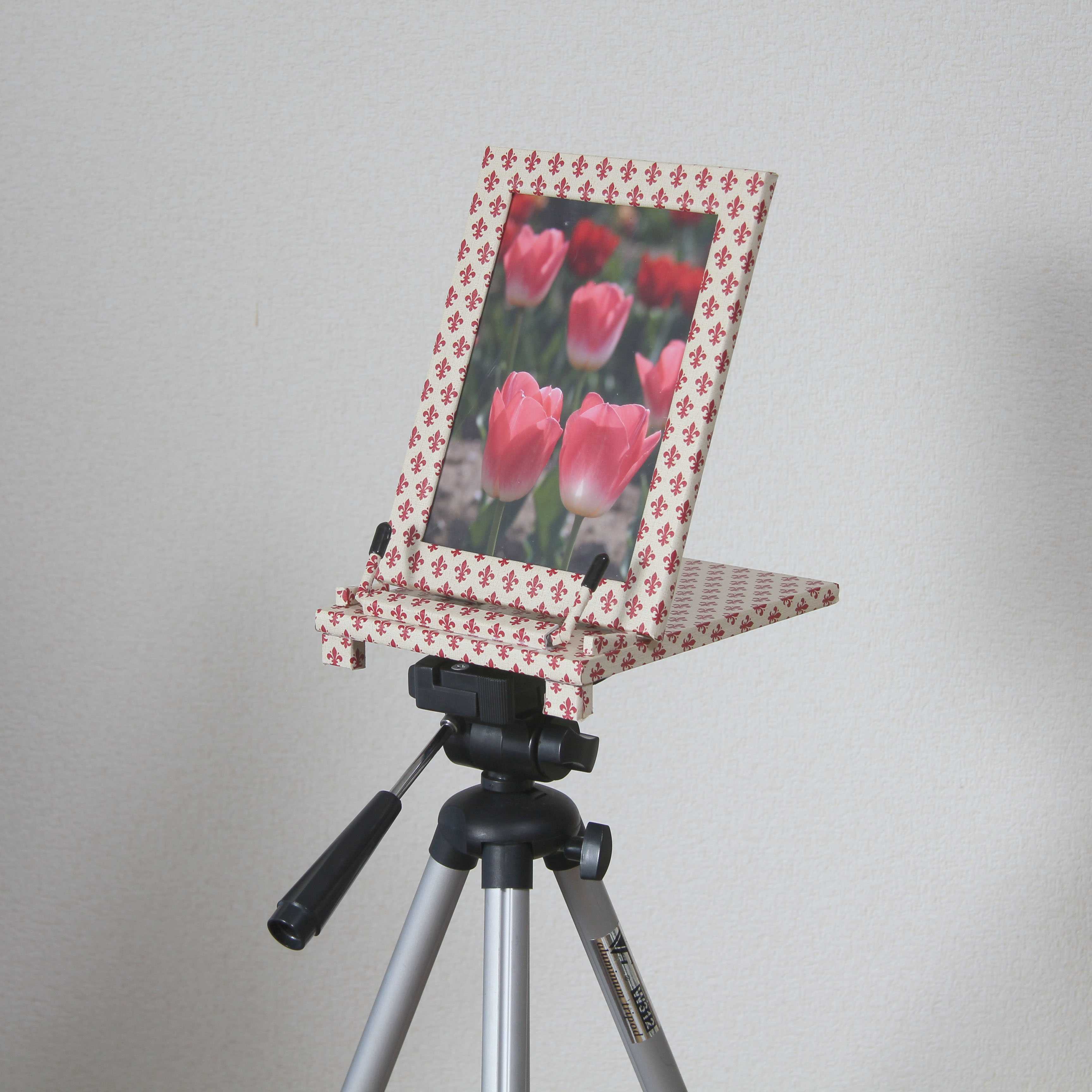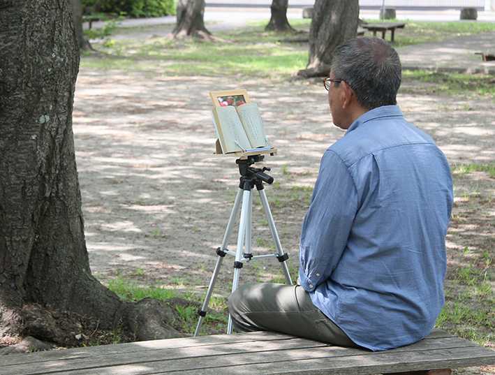 カメラ用三脚に書見台を取り付けての読書は実現しましたが、市販されている書見台は机上で読書するためのもので、友人ともっと多目的に書見台を活用することを考えてみようと話し合いを重ねました。♬新しいアイデアが生まれて来ました。♬☆(写真1)読書しない時には机上に置いて好きな写真を飾っておくフォトフレームとしても利用 して写真の入れ替えも出来ることにする。 ★(写真2)読書する時は本を挟んで机上で通常の書見台として使用する。☆(写真3)机上以外の自由な空間では椅子やベンチに腰掛けて書見台をカメラ用三脚に取り付け て最適な高さと角度で読書出来るようにする。 (写真1) (写真2) (写真3) 戸外での使用例 ★三脚取付け書見台の利点★ 1)両手を離しての読書が可能 2)読み易い最適な高さと角度調整が可能 3)何処にでも持ち出し設置可能