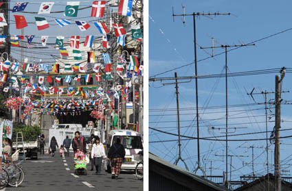 今日は日暮里に下車した。この駅は高台に位置しており、橋の上からの電車の見晴らしが良くて小さな子供づれの親子が様々な電車の往き来に歓声を上げている。坂道を数分歩くと有名な「夕焼けだんだん」に着く。大きな空の下には谷中商店街が見える。やはりここは夕焼け空と商店街の明かりが灯る夕方の風景が印象的だ。商店街を抜けて田端~尾久と歩くうち「アレ!」という風景にぶつかった。商店街を華やかに見せるために万国旗が空一面を覆っていた。大きな空を見た後なので、雨が降ったら仕舞うのかなあとか要らぬ心配までしてみた。そういえば狭い路地の電柱に張り巡らされた電線が電話やインターネットケーブルで益々空一面を覆っていくのだろうか?尾久~王子~田端~日暮里とひとまわりして、街の広告の色使いが年々悪どくなって景観を悪くしていくことを一人で嘆いて見たりしながら黙々と歩いていたら、あれだけ青かった空がすっかり曇って夜は雪となってしまった。「今日は良い写真が撮れなかったなあと嘆きの一日となりました」