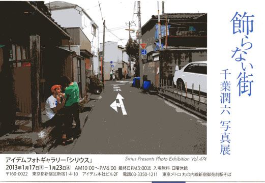 1年近くブログを休んでいました。休み癖が付いてしまうとなかなか日記を書くのが骨でブログやツイッターを毎日更新する人は偉いと思う。その間、いつもの如く下町を黙々と歩くことは続けていました。春から夏へと陽が高くなるにつれて風景が面白くなくなってしまい、秋から冬へと陽が低くなると共に同じ街角が新鮮に見えてくるから不思議です。そんな街角を徘徊しているうちに写真が溜まってきて写真展を開催することが決まりました。写真展タイトル:「飾らない街」場所:新宿御苑前 アイデム・フォトギャラリー「シリウス」日時:2013-1/17(木)~1/23(水)AM10:00~PM6:00日曜休み新宿御苑前ですのでお近くにお越しの節はお立ち寄りください。