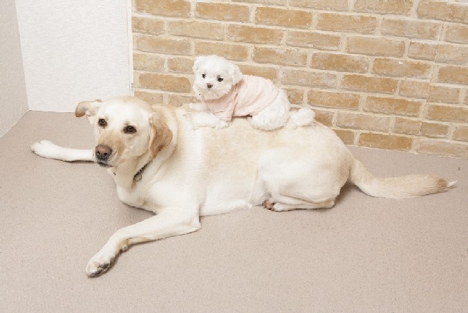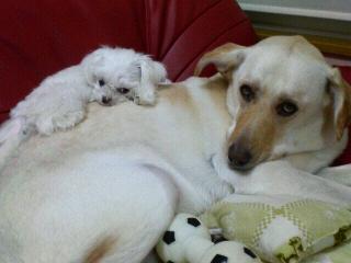 大きなワンちゃんは、見た目威圧感があって怖がられる事が多いけど、そんなことはありません。中には気の強いコもいるかもしれませんが、ほとんどのコは落ち着きがあって優しいコ達だとおもいます。ベリコも、自分のおもちゃで遊んでてらいこに取られそうになると、自分から離してらいこにおもちゃを譲ってあげたり、ルビコがベリコの上に乗って寝てても、嫌がりもせず一緒にねてます!でも、5.5キロのらいこを乗せたら嫌がるだろうと思い、ベリコには悪いと思ったのですが、さっき寝てるベリコの上にらいこを乗せてみました!そしたら、“なに!?”という顔をしたものの、また寝に入ってしまいました。ホント、ベリコは心の優しいコです!