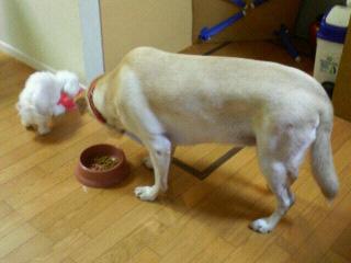 ベリコとルビコ、仲良く夕食タイムルビコは、食欲旺盛で自分のご飯が終わると、急いでベリコのご飯の元に駆け寄ってきますそして、ベリコのご飯の器に顔を突っ込んだり、ベリコの口からこぼれる粒を待っています。でもベリコのご飯は、大粒なのでルビコには大きすぎますしかも、普通にベリコのご飯をルビコにあげる時は、一粒一粒カリカリと噛んで食べるのに、ベリコが食べているのを横取りしたり拾った時は、怒られる!と思い丸呑みしちゃいますその為、消化不良で全て吐いてしまいますなのでベリコは、ちょっと高さのある台の上にご飯を置いて食べてたのですが・・・最近はまた、ルビコと同じ床の上でたべるようになりました。今までは、口の高さがちょうど正面で食べやすかったのですが、床だと頭が下にいくのでご飯も喉に通りにくいのか途中でお座りをして休んでいます