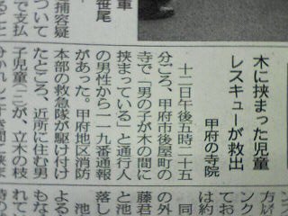 昨日は4月13日の金曜日でしたかの有名な「ジェイソン」が現れると言う「13日の金曜日」に加えて4月!和洋折衷の最悪な1日が予想されていましたみなさま、いかがお過ごしになられましたでしょうか?σ( ̄∇ ̄;)わて?は、、、ジェイソンが怖いので早く寝ましたよ、、、前日の心労も加わって、血圧急上昇でしたから、午後の8時30分には就寝しました...orzえっ?前日の心労って?????前日の朝、かあちゃんが咳き込んでいる様子なので、メールでそれとなく様子を探ってみると、3rdを保育園に送ってから家で寝ているとのこと早めに主治医への受診を促しても、「車を運転するのがめんどい」との返事それでは、たまには女房孝行をしようと、3rdのお迎え&かかりつけ医への受診をしてきましわその帰り道、うしろからサイレンが聞こえたので左側に停車していると、レスキュー工作車が追い越していきました駐車場で車を降りると、近所の子供たちが、「公園にレスキューがきてるよ!」って先程のレスキュー工作車が近所の公園にいるらしいですうちの子供たちも良く行く公園なので、状況を確認に行くと、、、知り合いのおじさんがいたので聞いてみると、「xxxx(1stの名前)が木に挟まってるよ」(゚ロ゚;)エェッ!? (゚゚;)エエッ ヽ(-0-ヽ)Ξ(/-0-)/ えー急いで、現場に行って見ると、木がY字に枝別れしている所に右の膝がすっぽり嵌ってました救急隊3人+レスキュー隊5人が懸命の救出作業をしてくれ、通報から50分後にようやく救出されました翌日のローカル新聞社会面には との記事が載ってましたわNHKローカルニュースにも救出の模様が映し出されていたそうですこんな道具で救助作業が行われました油圧スプレッター 交通事故などで、車のドアが開かない時や足などが挟まれている時にこの道具を使ってドアを開けたり広げたりして救出します。マット型空気ジャッキ 交通事故で、車の下に挟まれた人を、マットで車を持ち上げて救出する。 このマットは、電車を持ち上げることができます。1st君!先日の始業式で脚光を浴び、今回の事件でも超有名人になりました事件の翌日にはローラーブレードで元気に遊んでたし、今日もサッカースポ少の練習に出かけました無事に生還できたことに、感謝しますご近所のみなさん、大変お騒がせいたしました m(。_。;))m ペコペコ…それにしても、3rd君は憧れのレスキュー隊員の救出作業を間近で見ることができ、1stの病院搬送に一緒に救急車に乗ることができ、「ぼくは大きくなったら、レスキュー隊員になりたいです」って…救急隊のお兄さんに話をしていたそうですちょうど履いていた靴も「ハイパーレスキュー」の靴でした