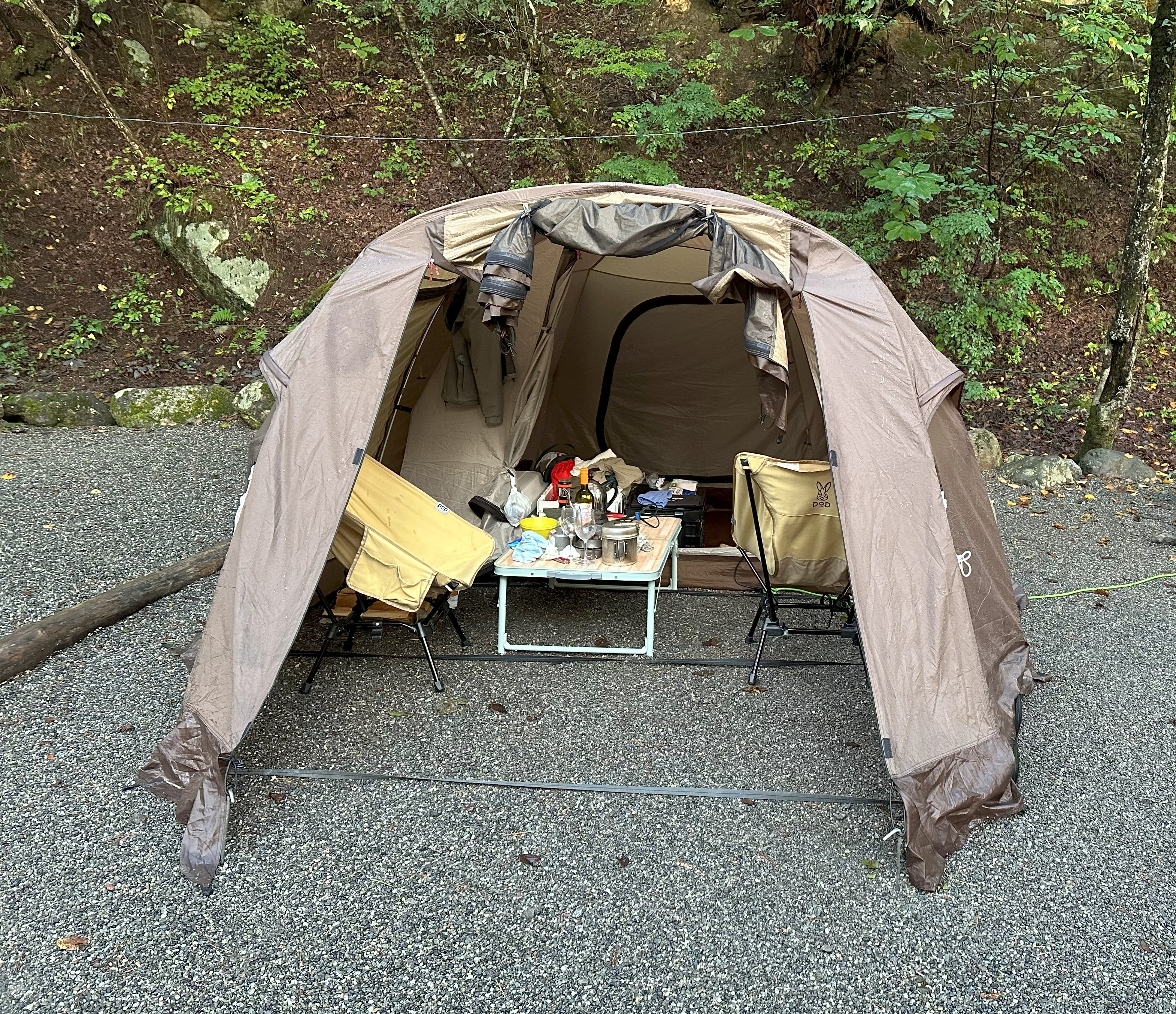 レンタルしたテントは、小川テントの「ティエラ・リンド」という廃番になったモデル(気になっていた「ファシル」はなかった)で、2ルームとはいかないが前室が広く、雨でも椅子、テーブルを置いても2人であればくつろげるタイプだ。組み立てもポールを立ててフライを被せてテープで固定するタイプで、サイズは大きいが組み立てやすかった。換気もサイドがメッシュになっている、解放できるなど使い勝手が良いものだった。