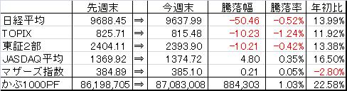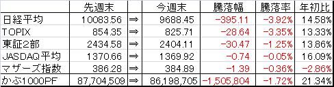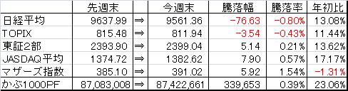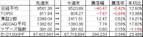 取引・なしPF(保有銘柄27銘柄)・2117 日新製糖HD×2,000株 (@1,630) 時価1,654△10 [PER1.1] [利回り3.63%]・2491 バリューコマース×150株 (@25,952) 時価26,700±0 [PER9.8] [利回り2.81%]・2769 ヴィレッジV×25株 (@120,184) 時価133,000▼2,500 [PER5.3] [利回り1.05%]・2814 佐藤食品工業×2,120株 (@1,017) 時価1,054△4 [PER9.7] [利回り2.85%]・3252 日本商業開発×16株 (@53,013) 時価90,000△2,000 [PER2.6] [利回り4.44%]・3275 ハウスコム×4,100株 (@587) 時価660△6 [PER6.8] [利回り4.39%]・3331 雑貨屋ブルドッグ×6,300株 (@207) 時価269▼1 [PER13.0] [利回り1.86%]・3766 システムズD×5,000株 (@322) 時価330±0 [PER23.0] [利回り3.03%]・4298 プロトコーポ×1,500株 (@2,578) 時価2,760▼17 [PER7.7] [利回り3.08%]・4644 イマジニア×4,600株 (@421) 時価452△9 [PER11.9] [利回り4.87%]・4792 山田コンサル×76株 (@56,254) 時価82,700▼5,300 [PER7.1] [利回り2.42%]・4901 富士フィルム×1,500株 (@1,751) 時価1,707▼22 [PER12.7] [利回り2.34%]・5108 ブリヂストン×1,000株 (@1,830) 時価1,905▼5 [PER8.9] [利回り1.68%]・5918 瀧上工業×18,000株 (@216) 時価240- [PER-] [利回り2.50%]・6274 新川×5,000株 (@392) 時価429▼9 [PER-] [利回り1.17%]・6357 三精輸送機×5,000株 (@405) 時価400±0 [PER9.3] [利回り3.50%]・6834 精工技研×400株 (@445) 時価652▼1 [PER-] [利回り-%]・6896 北川工業×3,100株 (@705) 時価875±0 [PER60.3] [利回り1.60%]・7314 小田原機器×2,600株 (@857) 時価793△11 [PER63.1] [利回り3.15%]・7458 第一興商×100株 (@984) 時価1,610▼1 [PER9.7] [利回り3.42%]・7874 レック×3,000株 (@1,060) 時価1,226▼6 [PER7.3] [利回り3.26%]・8191 光製作所×8,000株 (@437) 時価599- [PER7.9] [利回り1.25%]・8245 丸栄×25,000株 (@108) 時価106±0 [PER98.1] [利回り0.00%]・9708 帝国ホテル×1,000株 (@1,800) 時価2,434▼34 [PER251.4] [利回り0.94%]・9856 ケーユーHD×5,000株 (@300) 時価558△10 [PER5.0] [利回り2.33%]・9866 マルキョウ×10,000株 (@448) 時価566△7 [PER10.3] [利回り2.74%]・9892 卑弥呼×5,000株 (@725) 時価847▼1 [PER14.2] [利回り5.90%]【年間予想受取配当額】(税引前) 1,906,800-1,929,600円 (配当利回り2.44-2.47%)【年間受取確定配当額】(税引前) 1,316,180円株式 77,422,180円(88.2%)CP 10,318,565円(11.8%)合計 87,740,745円【年初来最高値】 89,044,513円(3/27)【年初来最低値】 71,850,256円(1/4)前日比 ▼397,059円週次 △318,084円月次 △36,236円年次 △16,700,239円+配当1,316,180円(年初より△23.5% ※配当含まず)☆今日のコメント☆「3日ぶり反落」【市況】 日経平均株価は3日ぶりに反落。後場に先物主導で乱高下した。日銀が追加緩和策としてETFの買い入れ増額などが好感され一時100円超上昇する場面もあった。ただその後先物への大口売りでマイナス圏に沈んだ。 新興市場も日経ジャスダック平均が6日ぶり反落。東証マザーズ指数も続落に。【保有銘柄】 前日大幅高の山田コンサルが大幅安。その他の銘柄は小動き。PFは3日ぶり反落に。【今日の売買】 なし【今日の一言】 今日は場中の値動きが大きかったが、売買タイミングが掴めずに動けなかった。 ☆今週のコメント☆「3週続伸。月次は僅かにプラス」 今週は+318,084円となり小幅ながら3週連続の上昇だった。月次は+36,236円と僅かにプラスながらも5ヶ月連続のプラス維持となった。 来週も企業の決算動向に注視して行きたい。
