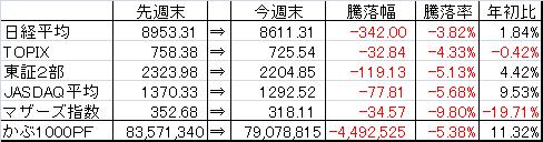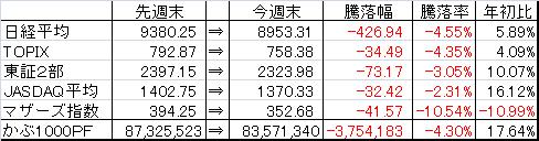 取引・【買付】・2769 ヴィレッジヴァンガード×10株 買付単価 119,200-119,800円・【買付】・3331 雑貨屋ブルドッグ×2,000株 買付単価 231-232円・【買付】・3766 システムズ・デザイン×900株 買付単価 309円・【買付】・7974 任天堂×100株 買付単価 9,750円・【売却】・6896 北川工業×3,100株 売却単価 850円(売却益+443,647円)PF(保有銘柄28→27銘柄)・2117 日新製糖HD×2,500株 (@1,627) 時価1,597▼13 [PER1.1] [利回り3.76%]・2491 バリューコマース×150株 (@25,952) 時価27,910▼1,140 [PER9.0] [利回り3.58%]・2769 ヴィレッジV×25→35株 (@119,920) 時価116,300▼6,200 [PER4.6] [利回り1.20%]・2814 佐藤食品工業×2,120株 (@1,017) 時価1,050▼18 [PER9.4] [利回り2.86%]・3252 日本商業開発×16株 (@53,013) 時価88,900- [PER8.2] [利回り3.37%]・3275 ハウスコム×4,100株 (@587) 時価662▼8 [PER6.8] [利回り4.38%]・3331 ブルドッグ×10,000→12,000株 (@226) 時価230▼12 [PER11.1] [利回り2.17%]・3766 システムズD×5,000→5,900株 (@320) 時価309±0 [PER10.1] [利回り3.24%]・4298 プロトコーポ×1,500株 (@2,578) 時価2,580▼96 [PER9.2] [利回り2.91%]・4644 イマジニア×4,600株 (@421) 時価435▼2 [PER11.5] [利回り5.06%]・4792 山田コンサル×76株 (@56,254) 時価78,000▼2,000 [PER6.0] [利回り3.85%]・4901 富士フィルム×2,500株 (@1,720) 時価1,635▼1 [PER12.1] [利回り2.45%]・5108 ブリヂストン×1,500株 (@1,808) 時価1,815△45 [PER8.5] [利回り1.76%]・5918 瀧上工業×17,000株 (@216) 時価230▼5 [PER-] [利回り2.61%]・6274 新川×5,000株 (@392) 時価388▼10 [PER-] [利回り1.29%]・6357 三精輸送機×5,000株 (@405) 時価399▼1 [PER18.5] [利回り3.51%]・6834 精工技研×400株 (@445) 時価612▼10 [PER50.8] [利回り0.82%]・7314 小田原機器×3,100株 (@841) 時価750ケ [PER59.7] [利回り3.33%]・7458 第一興商×100株 (@984) 時価1,537▼12 [PER9.3] [利回り3.58%]・7874 レック×4,000株 (@1,069) 時価1,034▼9 [PER9.8] [利回り3.87%]・7974 任天堂×100→200株 (@9,870) 時価9,750▼600 [PER62.3] [利回り1.03%]・8191 光製作所×8,000株 (@437) 時価561▼10 [PER7.4] [利回り1.34%]・8245 丸栄×30,000株 (@106) 時価96▼3 [PER88.9] [利回り0.00%]・9708 帝国ホテル×1,000株 (@1,800) 時価2,420△1 [PER34.2] [利回り0.95%]・9856 ケーユーHD×5,000株 (@300) 時価534△14 [PER4.0] [利回り3.37%]・9866 マルキョウ×5,000株 (@450) 時価520±0 [PER9.4] [利回り2.98%]・9892 卑弥呼×5,000株 (@725) 時価841△1 [PER14.1] [利回り5.95%]【年間予想受取配当額】(税引前) 2,243,200円 (配当利回り2.87%)【年間受取確定配当額】(税引前) 1,316,180円株式 78,109,700円(93.5%)CP 5,461,640円(6.5%)合計 83,571,340円【年初来最高値】 89,044,513円(3/27)【年初来最低値】 71,850,256円(1/4)前日比 ▼1,070,612円週次 ▼3,754,183円月次 ▼4,169.405円年次 △12,530,834円+配当1,316,180円(年初より△17.6% ※配当含まず)☆今日のコメント☆「大幅に3日続落」【市況】 日経平均株価は3日続落。終値での9,000円割れは2月13日以来。朝方は上昇して始まったが、次第に売りに押された。アジア株が軒並み下落こともあり下値を模索の展開。騰落銘柄数は値上がり198銘柄、値下がり1,415銘柄とほぼ全面安に。 新興市場は日経ジャスダック平均、東証マザーズ指数ともに反落へ。【保有銘柄】 ヴィレッジヴァンガード、バリューコマース、プロトなど小型株の下落が目立った。前日上昇の任天堂も大幅安に。反面、前日業績の上方修正+増配発表のケーユーは終日底堅い展開だった。PFは大幅に3日続落に。【今日の売買】(買い)ヴィレッジヴァンガード、ブルドッグ、任天堂、システムズ・デザインを買い増し。いずれも難平買いへ。(売り)北川工業を売却。CPが低下した事から比較的値持ちが良かった北川工業を売却してCPを維持した。【今日の一言】 日本商業開発、三精輸送機、帝国ホテル、佐藤食品、プロト、精工技研の6銘柄が決算発表。プロト、三精輸送機は予想より悪い決算。その他の銘柄はほぼ予想の範囲内だった。 ☆今週のコメント☆「大幅続落に」 今週は-3,754,183円(-4.3%)と今年最大の下落幅となった。市場全体の軟調な流れをもろに受けてしまった格好。バリューコマース、山田コンサルなどの急騰銘柄の利食いタイミングを逃したことも大きかった。 来週は東証一部の騰落レシオは66.5まで低下+ボラティリティも大きくなりつつあるので、ある意味転換点を迎える可能性がある一週間になると思われる。決算も徐々に出揃いつつあるので、銘柄の入れ替えなど、これ以上PFが劣化しないように頑張って行きたい。