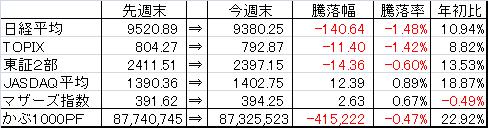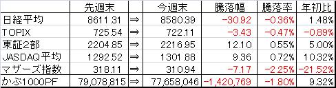 取引・なしPF(保有銘柄25銘柄)・2117 日新製糖HD×3,000株 (@1,612) 時価1,533△1 [PER7.1] [利回り3.91%]・2491 バリューコマース×150株 (@25,952) 時価25,460△110 [PER8.2] [利回り3.93%]・2769 ヴィレッジV×35株 (@119,920) 時価104,700▼1,700 [PER4.1] [利回り1.34%]・2814 佐藤食品工業×2,500株 (@1,020) 時価1,035△15 [PER9.2] [利回り2.90%]・3252 日本商業開発×16株 (@53,013) 時価78,000ケ [PER7.2] [利回り3.85%]・3275 ハウスコム×4,100株 (@587) 時価623▼10 [PER6.4] [利回り4.65%]・3277 サンセイランディック×3,000株 (@284) 時価253▼1 [PER4.4] [利回り1.19%]・3331 ブルドッグ×14,000株 (@223) 時価212△2 [PER10.2] [利回り2.36%]・3766 システムズD×6,000株 (@320) 時価314△5 [PER10.3] [利回り3.18%]・4298 プロトコーポ×1,500株 (@2,578) 時価2,331△33 [PER8.3] [利回り3.22%]・4644 イマジニア×4,600株 (@421) 時価415▼10 [PER12.7] [利回り5.30%]・4792 山田コンサル×77株 (@56,521) 時価72,800▼4,000 [PER5.6] [利回り4.12%]・4901 富士フィルム×2,500株 (@1,720) 時価1,505▼10 [PER11.2] [利回り2.66%]・5108 ブリヂストン×1,500株 (@1,808) 時価1,705△29 [PER7.9] [利回り1.88%]・5918 瀧上工業×17,000株 (@216) 時価219△5 [PER48.7] [利回り2.74%]・6274 新川×6,000株 (@398) 時価376△3 [PER-] [利回り1.33%]・6834 精工技研×400株 (@445) 時価587△6 [PER48.8] [利回り0.85%]・7314 小田原機器×3,100株 (@841) 時価775△4 [PER61.7] [利回り3.23%]・7458 第一興商×100株 (@984) 時価1,578△45 [PER8.7] [利回り3.49%]・7874 レック×4,000株 (@1,069) 時価967△4 [PER9.1] [利回り4.14%]・7974 任天堂×400株 (@9,525) 時価8,850▼100 [PER56.6] [利回り1.13%]・8191 光製作所×15,000株 (@459) 時価454▼4 [PER7.4] [利回り1.65%]・9856 ケーユーHD×5,000株 (@300) 時価464▼4 [PER4.7] [利回り4.31%]・9866 マルキョウ×5,000株 (@450) 時価449▼3 [PER8.2] [利回り3.45%]・9892 卑弥呼×5,000株 (@725) 時価835△6 [PER10.0] [利回り5.99%]【年間予想受取配当額】(税引前) 2,297,100円 (配当利回り3.14%)【年間受取確定配当額】(税引前) 1,316,180円株式 73,146,500円(94.2%)CP 4,511,546円(5.8%)合計 77,658,046円【年初来最高値】 89,044,513円(3/27)【年初来最低値】 71,850,256円(1/4)前日比 ▼241,200円週次 ▼1,420,769円月次 ▼10,082,699円年次 △6,617,540円+配当1,316,180円(年初より△9.3% ※配当含まず)☆今日のコメント☆「3日続落」【市況】 日経平均株価は小幅に続伸。前日の欧米株式市場が上昇した流れを受け序盤は買いが先行した。一時は8600円を回復する場面もあったが、その後は伸び悩む展開。売買代金は1兆円割れと低水準に。日経平均は週足で8週連続の下落となり、1992年の9週連続安に次ぐ水準に。 新興市場は日経ジャスダック平均が反発、東証マザーズ指数ともは3日続落に。【保有銘柄】 朝方は堅調な銘柄が多かったものの、その後伸び悩みPFはマイナス圏まで下落。山田コンサル、任天堂、光製作所など保有株数の多い銘柄の下落が響いた。PFは3日続落に。【今日の売買】 なし【今日の一言】 なかなか反転しきれない状況が続く。保有株の下落も続いており、なかなか乗り換えも出来ず難しい判断の日々が続いている。 ☆今週のコメント☆「3週連続マイナスに」 今週は-1,420,769円と3週連続のマイナスに。マイナス幅は先週に比べて減少したがそれでも7桁のマイナスは大きい。今週は任天堂、ブシヂストン、富士フィルムなど大型株の下落が響いた。その半面で瀧上工業、システムズデザイン、ブルドッグなどネットネット、超低PBR銘柄は底堅かった。 来週も株価は当面大きく上昇することがない前提で、少しずつ戻りが早そうな銘柄やより割安な銘柄ににシフトして行きたい。