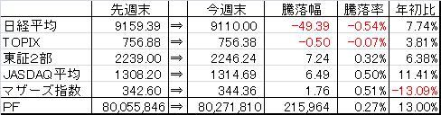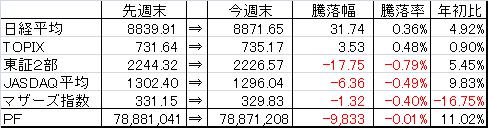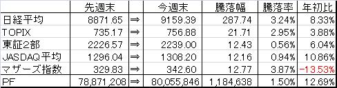 取引・なしPF(保有銘柄27銘柄)・2117 日新製糖HD×4,000株 (@1,581) 時価1,497▼1 [PER6.9] [利回り4.01%]・2408 KG情報×5,000株 (@432) 時価465▼5 [PER5.8] [利回り2.15%]・2428 ウェルネット×4,000株 (@729) 時価682△9 [PER10.5] [利回り3.23%]・2814 佐藤食品工業×2,000株 (@1,020) 時価951▼17 [PER8.5] [利回り3.15%]・3252 日本商業開発×26株 (@62,162) 時価77,000△3,000 [PER7.1] [利回り3.90%]・3331 雑貨屋ブルドッグ×15,000株 (@218) 時価203±0 [PER9.8] [利回り2.46%]・3766 システムズD×4,800株 (@320) 時価277±0 [PER9.1] [利回り3.61%]・3768 リスクモンスター×6,000株 (@372) 時価399△4 [PER13.0] [利回り2.01%]・4298 プロトコーポ×2,000株 (@1,291) 時価1,224△13 [PER8.7] [利回り3.06%]・4310 DI×40株 (@64,115) 時価62,700▼900 [PER5.8] [利回り-%]・4792 山田コンサル×67株 (@56,486) 時価76,400△400 [PER5.9] [利回り3.93%]・4901 富士フィルム×4,500株 (@1,484) 時価1,308▼5 [PER9.7] [利回り3.06%]・5918 瀧上工業×15,000株 (@216) 時価216- [PER48.0] [利回り2.78%]・5988 パイオラックス×2,500株 (@1,617) 時価1,629△9 [PER5.6] [利回り2.15%]・6834 精工技研×5,000株 (@450) 時価462▼10 [PER38.5] [利回り1.08%]・6935 日本デジタル研究所×500株 (@807) 時価852△7 [PER9.2] [利回り2.35%]・7314 小田原機器×2,100株 (@844) 時価696ケ [PER55.4] [利回り3.59%]・7404 昭和飛行機工業×6,000株 (@436) 時価410▼14 [PER21.6] [利回り1.71%]・7646 PLANT×6,000株 (@597) 時価563△1 [PER2.3] [利回り5.33%]・8191 光製作所×16,000株 (@459) 時価472- [PER7.7] [利回り1.59%]・8725 MS&AD×1,500株 (@1,261) 時価1,351▼20 [PER10.5] [利回り4.00%]・9856 ケーユーHD×5,000株 (@300) 時価447▼17 [PER4.5] [利回り4.47%]・9866 マルキョウ×5,000株 (@450) 時価436▼1 [PER7.9] [利回り3.56%]・9892 卑弥呼×5,000株 (@725) 時価894▼6 [PER10.7] [利回り5.59%]※第一興商、三共生興、トランコムは最低単元の優待銘柄のため省略【年間予想受取配当額】(税引前) 2,270,250-2,275,250円 (配当利回り3.07%)【年間受取確定配当額】(税引後) 1,874,639円株式 73,842,800円(93.3%)CP 5,284,513円(6.7%)合計 79,127,533円【年初来最高値】 89,044,513円(3/27)【年初来最低値】 71,850,256円(1/4)前日比 ▼151,980円週次 ▼1,144,277円+配当425,250円月次 △246,492円+配当515,250円年次 △8,087,027円+配当1,874,639円(年初より△11.3% ※配当含まず)☆今日のコメント☆「反落」【保有銘柄動向】 前日下落が目立った日本商業開発、パイオラックスは反発したものの、富士フィルム、MS&ADなど大型株が軟調。ケーユー、昭和飛行機など保有株数の多い銘柄の下落が響き、PFは反落に。【今日の売買】 なし【今日の一言】 現在、株主優待目的で保有の第一興商、三共生興、トランコム以上3銘柄の株価表示を今回より勝手ながら省略する事にしました。これらの銘柄は3銘柄足してもPFに占める比率が0.4%と低いので、運用成績に影響はないと判断しました。作業効率簡略化のためご理解頂けたら幸いです。☆今週のコメント☆「大幅反落」 今週は▼1,144,277円と3週ぶりの大幅反落となった。配当落ち分が425,250円あるが、それを加味してもマイナスの成績だった。今週は日経平均が大きく下落した半面、ジャスダック、マザーズはプラスと明暗が分かれた一週間だった。 来週以降も株価は軟調な地合いが続く可能性もあるが、割安銘柄の下落した場面では買いを入れて行きたい。