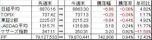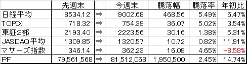 取引・なしPF(保有銘柄28銘柄)・2117 日新製糖HD×4,000株 (@1,581) 時価1,493△3 [PER6.9] [利回り4.02%]・2408 KG情報×5,000株 (@432) 時価447△7 [PER5.6] [利回り2.24%]・2428 ウェルネット×4,000株 (@729) 時価680△4 [PER10.5] [利回り3.24%]・2814 佐藤食品工業×2,000株 (@1,020) 時価893△3 [PER8.0] [利回り3.36%]・3252 日本商業開発×26株 (@62,162) 時価87,600±0 [PER5.4] [利回り5.71%]・3331 雑貨屋ブルドッグ×15,000株 (@218) 時価214△7 [PER8.8] [利回り2.34%]・3768 リスクモンスター×6,000株 (@372) 時価445△9 [PER14.5] [利回り1.80%]・4062 イビデン×1,000株 (@997) 時価1,067△52 [PER17.0] [利回り2.81%]・4298 プロトコーポ×2,000株 (@1,291) 時価1,278△31 [PER9.1] [利回り2.93%]・4310 DI×40株 (@64,115) 時価66,200△500 [PER6.2] [利回り-%]・4792 山田コンサル×67株 (@56,486) 時価85,000△1,700 [PER6.6] [利回り3.53%]・4901 富士フィルム×4,500株 (@1,484) 時価1,419△35 [PER10.5] [利回り2.82%]・5918 瀧上工業×15,000株 (@216) 時価211- [PER46.9] [利回り2.84%]・5988 パイオラックス×2,500株 (@1,617) 時価1,690△54 [PER5.8] [利回り2.07%]・6758 ソニー×1,000株 (@918) 時価983△27 [PER49.4] [利回り2.54%]・6834 精工技研×5,000株 (@450) 時価470▼1 [PER39.2] [利回り1.06%]・6935 日本デジタル研究所×500株 (@807) 時価836△19 [PER9.0] [利回り2.39%]・7314 小田原機器×2,100株 (@844) 時価700△13 [PER55.7] [利回り3.57%]・7404 昭和飛行機工業×6,000株 (@436) 時価396▼4 [PER20.9] [利回り1.77%]・7646 PLANT×6,000株 (@597) 時価559△2 [PER2.3] [利回り5.37%]・8191 光製作所×16,000株 (@459) 時価481±0 [PER7.9] [利回り1.56%]・9708 帝国ホテル×50株 (@2,037) 時価2,101△1 [PER29.7] [利回り1.09%]・9856 ケーユーHD×5,000株 (@300) 時価436±0 [PER4.4] [利回り4.59%]・9866 マルキョウ×5,000株 (@450) 時価438ケ [PER8.0] [利回り3.54%]・9892 卑弥呼×5,000株 (@725) 時価909△2 [PER10.9] [利回り5.50%]※第一興商、三共生興、トランコムは株主優待目的銘柄のため省略【年間予想受取配当額】(税引前) 2,249,400-2,254,400円 (配当利回り3.01%)【年間受取確定配当額】(税引後) 1,874,639円株式 74,651,650円(91.8%)CP 6,625,928円(8.2%)合計 81,277,578円【年初来最高値】 89,044,513円(3/27)【年初来最低値】 71,850,256円(1/4)前日比 △827,050円週次 △1,716,010円月次 △2,150,045円年次 △10,237,072円+配当1,874,639円(年初より△14.4% ※配当含まず)☆今日のコメント☆「6日続伸へ」【保有銘柄動向】 富士フィルム、ソニー、イビデンなど主力大型株が相場全体の上昇から堅調。前日下落したパイオラックスが大幅反発となるなど、保有銘柄全般堅調で、PFは6日続伸。6日間での上昇幅は+215万に。【今日の売買】 なし【今日の一言】 日経平均が9,000円近辺まで急上昇。今週のみで450円近く上昇しており、短期的には高値警戒感も出始める頃だが、果たして??
