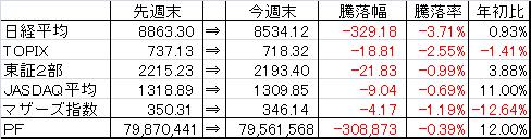 取引・【買付】・3252 日本商業開発×9株 買付単価 78,000-80,300円PF(保有銘柄28銘柄)・2117 日新製糖HD×4,000株 (@1,581) 時価1,502△9 [PER6.9] [利回り3.99%]・2408 KG情報×5,000株 (@432) 時価452△5 [PER5.6] [利回り2.21%]・2428 ウェルネット×4,000株 (@729) 時価677▼3 [PER10.5] [利回り3.25%]・2814 佐藤食品工業×2,000株 (@1,020) 時価891▼2 [PER8.0] [利回り3.37%]・3252 日本商業開発×26→35株 (@66,498) 時価77,700▼9,900 [PER4.8] [利回り6.44%]・3331 雑貨屋ブルドッグ×15,000株 (@218) 時価215△1 [PER8.8] [利回り2.33%]・3768 リスクモンスター×6,000株 (@372) 時価451△6 [PER14.6] [利回り1.77%]・4062 イビデン×1,000株 (@997) 時価1,060▼7 [PER16.9] [利回り2.83%]・4298 プロトコーポ×2,000株 (@1,291) 時価1,262▼16 [PER9.0] [利回り2.97%]・4310 DI×40株 (@64,115) 時価67,300△1,100 [PER6.3] [利回り-%]・4792 山田コンサル×67株 (@56,486) 時価87,000△2,000 [PER6.7] [利回り3.45%]・4901 富士フィルム×4,500株 (@1,484) 時価1,432△13 [PER10.6] [利回り2.79%]・5918 瀧上工業×15,000株 (@216) 時価210▼1 [PER46.7] [利回り2.86%]・5988 パイオラックス×2,500株 (@1,617) 時価1,696△6 [PER5.9] [利回り2.06%]・6758 ソニー×1,000株 (@918) 時価983±0 [PER49.4] [利回り2.54%]・6834 精工技研×5,000株 (@450) 時価470±0 [PER39.2] [利回り1.06%]・6935 日本デジタル研究所×500株 (@807) 時価846△10 [PER9.1] [利回り2.36%]・7314 小田原機器×2,100株 (@844) 時価700±0 [PER55.7] [利回り3.57%]・7404 昭和飛行機工業×6,000株 (@436) 時価397△1 [PER20.9] [利回り1.76%]・7646 PLANT×6,000株 (@597) 時価583△24 [PER2.7] [利回り5.15%]・8191 光製作所×16,000株 (@459) 時価481±0 [PER7.9] [利回り1.56%]・9708 帝国ホテル×50株 (@2,037) 時価2,102△1 [PER29.7] [利回り1.09%]・9856 ケーユーHD×5,000株 (@300) 時価441△5 [PER4.4] [利回り4.54%]・9866 マルキョウ×5,000株 (@450) 時価438- [PER8.0] [利回り3.54%]・9892 卑弥呼×5,000株 (@725) 時価915△6 [PER11.0] [利回り5.46%]※第一興商、三共生興、トランコムは株主優待目的銘柄のため省略【年間予想受取配当額】(税引前) 2,294,400-2,299,400円 (配当利回り3.03%)【年間受取確定配当額】(税引後) 1,874,639円株式 75,598,200円(92.7%)CP 5,913,868円(7.3%)合計 81,512,068円【年初来最高値】 89,044,513円(3/27)【年初来最低値】 71,850,256円(1/4)前日比 △234,490円週次 △1,950,500円月次 △2,384,535円年次 △10,471,562円+配当1,874,639円(年初より△14.7% ※配当含まず)☆今日のコメント☆「7日続伸」【保有銘柄動向】 富士フィルム、ソニー、イビデンなど主力大型株はまちまち。反面、山田コンサル、PLANT、ドリームインキュベータなど小型株中心に堅調で、PFは7日続伸に。【今日の売買】(買い)日本商業開発を買い増し。業績の上方修正+増配発表後急騰したが、今日は一転商いを伴って急落ししため買い増し。PER4.8倍、配当利回り6.44%と割安な点を評価。【今日の一言】 日経平均は辛うじて9,000円の大台乗せ。例年株式相場は11月に買って翌年の5月に売れば勝率が高いとされるが、その先回り買いが入っている可能性もあり、今後の動きに注目したい。☆今週のコメント☆「大幅反発へ」 今週は+1,950,500円と大幅に反発となったものの、日経平均、TOPIXなどの上昇率には及ばなかった。今週はこれまで下落が続いた富士フィルム、イビデン、ソニーなど主力大型株の上昇が目立ち、山田コンサル、PLANTなどの小型株もしっかりだった。 来週は、先週末のNY市況が大幅安となっていることから、月曜日は調整ムードとなりそうだが、それ以降どう動くのか注視しつつ、適切に対処して行きたい。