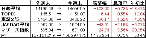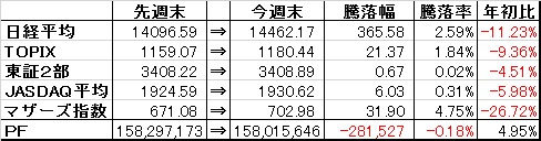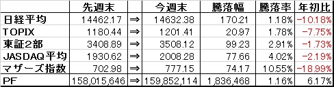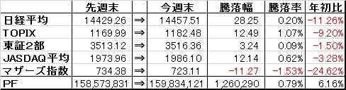 取引・【売却】・7856 萩原工業×1,000株 売却単価 1,548円(売却益+226,872円)PF(保有銘柄26→25銘柄)・1904 大成温調×10,000株 (@407) 時価431▼5 [PBR0.31] [利回り3.48%]・2117 日新製糖×5,500株 (@2,107) 時価2,178△2 [PBR0.34] [利回り2.75%]・3001 片倉工業×7,500株 (@1,174) 時価1,224△10 [PBR0.80] [利回り0.82%]・5484 東北特殊鋼×2,000株 (@1,096) 時価1,130△10 [PBR0.51] [利回り1.06%]・5757 CKサンエツ×500株 (@1,101) 時価1,158▼24 [PBR0.44] [利回り1.04%]・6156 エーワン精密×1,600株 (@3,021) 時価3,250△10 [PBR0.65] [利回り2.03%]・6159 ミクロン精密×500株 (@2,303) 時価2,500- [PBR0.71] [利回り1.60%]・6787 メイコー×8,000株 (@612) 時価599△8 [PBR0.35] [利回り1.67%]・6804 ホシデン×10,000株 (@540) 時価562▼1 [PBR0.41] [利回り1.78%]・6930 日本アンテナ×10,000株 (@619) 時価655△5 [PBR0.38] [利回り3.21%]・7314 小田原機器×15,000株 (@929) 時価1,158△15 [PBR0.38] [利回り2.16%]・7521 ムサシ×5,500株 (@1,120) 時価1,083▼12 [PBR0.33] [利回り1.85%]・7932 ニッピ×13,000株 (@769) 時価720△16 [PBR0.47] [利回り1.39%]・8191 光製作所×24,000株 (@694) 時価750ケ [PBR0.33] [利回り1.00%]・9308 イヌイ倉庫×12,000株 (@894) 時価896▼4 [PBR0.86] [利回り2.01%]・9322 川西倉庫×7,500株 (@580) 時価600△1 [PBR0.29] [利回り1.67%]・9760 進学会×15,000株 (@403) 時価366▼2 [PBR0.31] [利回り2.73%]・9866 マルキョウ×15,000株 (@490) 時価517△2 [PBR0.20] [利回り3.00%]・9885 シャルレ×5,000株 (@514) 時価487▼2 [PBR0.46] [利回り3.08%]・9892 卑弥呼×2,500株 (@755) 時価810△9 [PBR0.45] [利回り1.23%]・***5 ********×400株 (@*,***) 時価*,***▼** [PBR*.**] [利回り*.**%]※第一興商、三共生興、プロト、コロナは最低単元の株主優待目的のため省略。【年間予想受取配当額】(税引前) 2,701,200-2,707,850円 (配当利回り1.98%)【年間受取確定配当額】(税引前) 2,032,825円株式 136,623,500円(85.5%)CP 23,228,614円(14.5%)合計 159,852,114円【年初来最高値】163,742,744円(1/29)【年初来最低値】150,556,918円(1/1)前日比 △488,911円週次 △1,836,468円月次 △712,093円年次 △9,295,196円+配当2,032,825円(年初より△6.17%※配当含まず)☆今日のコメント☆「3日続伸」【保有銘柄動向】 日経平均株価は7日ぶりに小反落。一方新興市場は堅調な動き。保有銘柄はニッピ、小田原機器、片倉工業、など保有株数の多い銘柄の上昇が貢献し、PFは3日続伸へ。【今日の売買】(売り)萩原工業をすべて売却。まだ上値余地はありそうだが、PFに対する比率も低いため着実に利益確定を優先へ。【今日の一言】 新興市場は一時下に振れたものの回復。力強い相場が戻りつつあるように感じた。☆今週のコメント☆「大幅反発」 今週は+1,836,468円と大幅反発になったものの、マザーズ指数が10%以上上昇するなど新興市場の上昇が目立った一週間だった。PFの上昇率は小幅に留まったものの、下落が続いたニッピ、メイコーなどが反転するなど底打ち感が感じられた1週間だった。 来週も新興市場を中心とした上昇が続くのか見極めて行きたい。※当ブログに掲載されているコメントは、あくまで個人的見解に基づくものであり、特定銘柄への投資を推奨するものではありません。また当ブログに書かれている事は100%正確であるとは限りません。くれぐれも投資は自己責任でお願い致します。