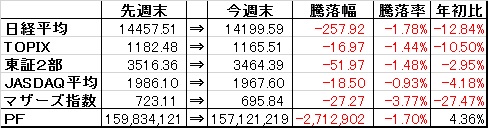 取引・【売却】・6159 ミクロン精密×200株 売却単価 2,580円(売却益+54,668円)・【買付】・7932 ニッピ×1,000株 買付単価 676円PF(保有銘柄25銘柄)・2117 日新製糖×5,500株 (@2,107) 時価2,141▼27 [PBR0.34] [利回り2.80%]・3001 片倉工業×5,500株 (@1,167) 時価1,221▼55 [PBR0.80] [利回り0.82%]・5484 東北特殊鋼×2,000株 (@1,096) 時価1,087△1 [PBR0.49] [利回り1.10%]・5757 CKサンエツ×500株 (@1,101) 時価1,185▼14 [PBR0.45] [利回り1.01%]・6156 エーワン精密×1,600株 (@3,021) 時価3,165- [PBR0.64] [利回り2.09%]・6159 ミクロン精密×900→700株 (@2,303) 時価2,503△73 [PBR0.71] [利回り1.60%]・6787 メイコー×6,000株 (@627) 時価577▼7 [PBR0.34] [利回り1.73%]・6804 ホシデン×10,000株 (@540) 時価504▼7 [PBR0.36] [利回り1.98%]・6839 船井電機×17,000株 (@1,107) 時価1,018▼3 [PBR0.30] [利回り3.44%]・6930 日本アンテナ×10,000株 (@619) 時価640▼10 [PBR0.37] [利回り3.28%]・7314 小田原機器×15,000株 (@929) 時価1,193▼57 [PBR0.39] [利回り2.10%]・7521 ムサシ×5,500株 (@1,120) 時価1,052△5 [PBR0.32] [利回り1.90%]・7856 萩原工業×2,500株 (@1,321) 時価1,437△5 [PBR0.70] [利回り2.78%]・7932 ニッピ×12,000→13,000株 (@769) 時価687▼31 [PBR0.45] [利回り1.46%]・8191 光製作所×24,000株 (@694) 時価735△5 [PBR0.32] [利回り1.02%]・9308 イヌイ倉庫×11,000株 (@895) 時価894▼5 [PBR0.86] [利回り2.01%]・9322 川西倉庫×7,500株 (@580) 時価591ケ [PBR0.29] [利回り1.69%]・9760 進学会×15,000株 (@403) 時価363▼10 [PBR0.31] [利回り2.75%]・9866 マルキョウ×15,000株 (@490) 時価517▼1 [PBR0.20] [利回り3.00%]・9885 シャルレ×5,000株 (@514) 時価486±0 [PBR0.46] [利回り3.09%]・***4 ****×6,000株 (@***) 時価***△* [PBR*.**] [利回り*.**%]※第一興商、三共生興、プロト、コロナは最低単元の株主優待目的のため省略。【年間予想受取配当額】(税引前) 3,231,200-3,244,850円 (配当利回り2.20-2.21%)【年間受取確定配当額】(税引前) 2,032,825円株式 147,105,600円(92.9%)CP 11,191,573円(7.1%)合計 158,297,173円【年初来最高値】163,742,744円(1/29)【年初来最低値】150,556,918円(1/1)前日比 ▼2,000,551円週次 △1,175,954円月次 ▼842,848円年次 △7,740,255円+配当2,032,825円(年初より△5.14%※配当含まず)☆今日のコメント☆「3日ぶりに大幅反落」【保有銘柄動向】 日経平均株価は3日続落。保有銘柄はニッピ、メイコー、ムサシ、進学会が年初来安値更新。上昇続いた小田原機器も大幅反落。反面、自社株買いを発表したミクロン精密は堅調だったが、PFは3日ぶりに大幅反落。再び月次マイナス転落へ。【今日の売買】(売り)ミクロン精密を一部売却。自社株買い発表を好感して大きく上昇したため利益確定へ。(買い)ニッピを買い増し。今日は年初来安値を大きく更新してきたが、決算内容も特段悪かったわけではなく、懸念があった財務状況も着実に改善してきている事から今後も買い増しして行きたいが、保有比率でPF6位水準まで保有数が増えているため、これ以上はなかなか買いにくいところ。【今日の一言】 今日はPFは大きく下落。最近振れが大きくなってきているので、見方を変えれば回転売買のチャンスとも見れるが、なかなかタイミングが合わず、少ししか実践できてないのでチャンスを逃さないようにして行きたい。☆今週のコメント☆「反発」 今週は+1,175,954円と反発となった。今週はPFも大きく変動したが、概ね決算内容で動いた銘柄が多かったので、一巡後は徐々に向かうべき方向性が出てくると思うので、行き過ぎたと思われる銘柄を中心に来週は売買して行きたい。※当ブログに掲載されているコメントは、あくまで個人的見解に基づくものであり、特定銘柄への投資を推奨するものではありません。また当ブログに書かれている事は100%正確であるとは限りません。くれぐれも投資は自己責任でお願い致します。