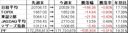 取引・【先物売建】・日経225mimi09×10枚 売建単価 19,885-19,905円・【先物返済】・日経225mimi09×10枚 返済単価 19,760円(売却益+134,180円)PF(保有銘柄26銘柄)・1916 日成ビルド×5,000株 (@339) 時価378▼5 [PBR1.47] [利回り3.70%]・2117 日新製糖×4,500株 (@2,108) 時価2,793△113 [PBR0.42] [利回り2.15%]・3123 サイボー×7,000株 (@569) 時価553▼1 [PBR0.53] [利回り2.53%]・4247 ポバール興業×7,000株 (@1,135) 時価1,191±0 [PBR0.36] [利回り2.52%]・4997 日本農薬×3,000株 (@1,033) 時価1,100▼4 [PBR1.39] [利回り1.36%]・5484 東北特殊鋼×3,000株 (@1,385) 時価1,380△5 [PBR0.58] [利回り1.01%]・5698 エンビプロHD×8,000株 (@641) 時価672▼5 [PBR0.57] [利回り3.72%]・5757 CKサンエツ×1,000株 (@1,122) 時価1,330▼10 [PBR0.46] [利回り0.90%]・6142 富士精工×27,000株 (@323) 時価415▼3 [PBR0.51] [利回り1.93%]・6156 エーワン精密×1,000株 (@3,145) 時価3,700△10 [PBR0.63] [利回り2.43%]・6365 電業社機械×3,700株 (@1,778) 時価1,944△9 [PBR0.52] [利回り3.09%]・6392 ヤマダコーポ×10,000株 (@398) 時価410△6 [PBR0.74] [利回り2.93%]・7314 小田原機器×3,500株 (@932) 時価1,156△37 [PBR0.38] [利回り2.77%]・7460 ヤギ×3,000株 (@1,647) 時価1,776△51 [PBR0.49] [利回り2.53%]・7485 岡谷鋼機×800株 (@7,054) 時価8,910△20 [PBR0.46] [利回り1.80%]・7533 グリーンクロス×2,000株 (@1,226) 時価1,279△18 [PBR1.13] [利回り3.36%]・7841 遠藤製作所×5,000株 (@396) 時価418△11 [PBR0.25] [利回り1,91%]・8045 横浜丸魚×13,000株 (@453) 時価582▼1 [PBR0.32] [利回り1.72%]・8191 光製作所×30,000株 (@721) 時価870▼14 [PBR0.37] [利回り0.86%]・8596 九州リース×16,000株 (@379) 時価435▼4 [PBR0.50] [利回り1.72%]・9302 三井倉庫HD×15,000株 (@385) 時価396▼2 [PBR0.72] [利回り2.53%]・9408 新潟放送×1,000株 (@555) 時価789△4 [PBR0.36] [利回り0.95%] ・9680 共成レンテム×4,000株 (@1,066) 時価1,090△15 [PBR0.59] [利回り1.83%] ・9866 マルキョウ×15,000株 (@489) 時価833△7 [PBR0.31] [利回り1.86%]※第一興商、プロトは最低単元の株主優待目的のため省略。【年間予想受取配当額】(税引前) 3,060,800-3,075,300円 (配当利回り2.00-2.01%)【年間受取確定配当額】(税引前) 1,564,900円株式 153,002,600円(90.2%)CP 16,592,899円(9.8%)合計 169,595,499円【年初来最高値】172,256,613円(6/26)【年初来最低値】142,716,357円(1/14)前日比 △486,600円週次 ▼2,125,180円月次 ▼1,168,700円年次 △25,475,581円+配当1,564,900円(年初より△17.83%※配当含まず)☆今日のコメント☆「3日ぶりに反発」【保有銘柄動向】 日経平均株価はプラスになる場面もあったが反落に。保有銘柄は日新製糖、小田原機器、ヤギ、遠藤製作所が堅調。反面、光製作所、日成ビルド、九州リースなどが軟調も、PFは3日ぶりに反発へ。【今日の売買】(先物売買)先物が13時頃より弱含み始めたため、CPも低くなっていたことからリスクヘッジのため先物を売り建て。ただその後下落したものの、下落幅は想定の範囲内だったため買戻しへ。結果的にはデイトレみたいな取引になってしまった。【今日の一言】 後場寄り後に先物主導で下落幅を広げる場面があり、再び下落するかと思ったが踏み留まった。一旦は底入れしたと考えるのがベターか。☆今週のコメント☆「大幅続落に」 今週は-2,125,180円と大幅続落となった。相場全体も軟調だっため下落はやむなしだが、先物ヘッジなどで多少は損失を回避出来た可能性もあり、オペーレーション的にはやや課題を残す結果となった。ただCPもあったことから、日頃から注目していた銘柄を中心に比較的安値で買い増せた事は良かったと思う。 来週は上海株式相場は徐々に落ち着きを取り戻しつつあるが、ギリシャ問題はまだ解決しておらず、再び急落する可能性もある。CPが10%弱まで低下したため、大きく上昇する銘柄があった場合はポジション調整をしてCPを少しは回復させて行きたいと思う。※当ブログに掲載されているコメントは、あくまで個人的見解に基づくものであり、特定銘柄への投資を推奨するものではありません。また当ブログに書かれている事は100%正確であるとは限りません。くれぐれも投資は自己責任でお願い致します。