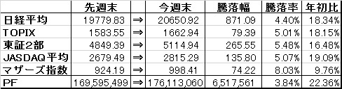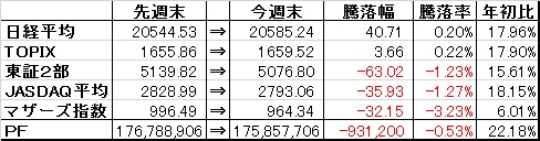 取引・なしPF(保有銘柄26銘柄)・1916 日成ビルド×5,000株 (@339) 時価405△1 [PBR1.58] [利回り3.46%]・2117 日新製糖×4,500株 (@2,108) 時価2,892△12 [PBR0.44] [利回り2.07%]・3123 サイボー×7,000株 (@569) 時価567▼2 [PBR0.55] [利回り2.47%]・4247 ポバール興業×7,000株 (@1,135) 時価1,209±0 [PBR0.37] [利回り2.48%]・4997 日本農薬×3,000株 (@1,033) 時価1,136△14 [PBR1.43] [利回り1.32%]・5484 東北特殊鋼×3,000株 (@1,385) 時価1,391▼9 [PBR0.59] [利回り1.01%]・5698 エンビプロHD×8,000株 (@641) 時価725△15 [PBR0.61] [利回り3.45%]・5757 CKサンエツ×1,000株 (@1,122) 時価1,398△28 [PBR0.48] [利回り0.86%]・6142 富士精工×27,000株 (@323) 時価430▼4 [PBR0.52] [利回り1.86%]・6156 エーワン精密×1,000株 (@3,145) 時価3,700▼30 [PBR0.63] [利回り2.43%]・6365 電業社機械×3,700株 (@1,778) 時価2,058△28 [PBR0.55] [利回り2.92%]・6392 ヤマダコーポ×10,000株 (@398) 時価417▼3 [PBR0.76] [利回り2.88%]・7314 小田原機器×3,500株 (@932) 時価1,180△6 [PBR0.38] [利回り2.71%]・7460 ヤギ×3,000株 (@1,647) 時価1,812▼26 [PBR0.50] [利回り2.48%]・7485 岡谷鋼機×800株 (@7,054) 時価9,300△50 [PBR0.48] [利回り1.72%]・7553 グリーンクロス×2,000株 (@1,226) 時価1,318▼12 [PBR1.17] [利回り3.26%]・7841 遠藤製作所×5,000株 (@396) 時価466△21 [PBR0.28] [利回り1.72%]・8045 横浜丸魚×13,000株 (@453) 時価601△3 [PBR0.33] [利回り1.66%]・8191 光製作所×30,000株 (@721) 時価948△38 [PBR0.40] [利回り0.79%]・8596 九州リース×16,000株 (@379) 時価454△6 [PBR0.52] [利回り1.65%]・9302 三井倉庫HD×15,000株 (@385) 時価408±0 [PBR0.74] [利回り2.45%]・9408 新潟放送×1,000株 (@555) 時価795▼10 [PBR0.36] [利回り0.94%] ・9680 共成レンテム×5,000株 (@1,068) 時価1,124▼4 [PBR0.60] [利回り1.78%] ・9866 マルキョウ×15,000株 (@489) 時価838ケ [PBR0.31] [利回り1.85%]※第一興商、プロトは最低単元の株主優待目的のため省略。【年間予想受取配当額】(税引前) 3,080,800-3,095,300円 (配当利回り1.92-1.93%)【年間受取確定配当額】(税引前) 1,564,900円株式 160,594,300円(91.2%)CP 15,518,760円(8.8%)合計 176,113,060円 ※4日連続で年初来最高値更新!【年初来最高値】176,113,060円(7/17)◎【年初来最低値】142,716,357円(1/14)前日比 △1,452,900円週次 △6,517,561円月次 △5,348,861円年次 △31,993,142円+配当1,564,900円(年初より△22.36%※配当含まず)☆今日のコメント☆「大幅に6日続伸へ」【保有銘柄動向】 日経平均株価は5日続伸。保有銘柄は日成ビルド、電業社、遠藤製作所が年初来高値更新。光製作所、エンビプロ、CKサンエツなども堅調。反面、グリーンクロスが年初来高更新後下落に転じ、ヤギ、新潟放送、富士精工なども軟調だったが、PFは6日続伸。4日連続で年初来最高値更新と上昇続く。【今日の売買】 なし【今日の一言】 PFの堅調続きここ6日間で+700万円に。金額面で見ると大きく感じるが、上昇率で見ると指数よりも劣っている結果に。☆今週のコメント☆「3週ぶりに大幅反発へ」 今週は+6,517,561円(+3.8%)と3週ぶりに大幅反発となった。しかしながら上昇率で見るといずれの指数よりも劣る結果でいかに相場全体が強かったか分かる週だった。先週購入した遠藤製作所、エンビプロを中心に、日成ビルド、三井倉庫、日新製糖、光製作所、電業社などが堅調。軟調だった銘柄は特になかった事も幸いした。 来週はギリシャ問題、上海の株式相場も落ち着きを取り戻しつつあり、外部要因の混乱は収束しつつあると思う。株価は今週大きく上昇したため、来週はさらに一段と上昇するには材料不足の感も否めない。個別の業績動向に一喜一憂しそうな1週間となりそう。※当ブログに掲載されているコメントは、あくまで個人的見解に基づくものであり、特定銘柄への投資を推奨するものではありません。また当ブログに書かれている事は100%正確であるとは限りません。くれぐれも投資は自己責任でお願い致します。