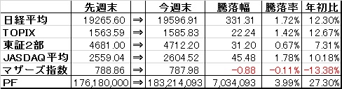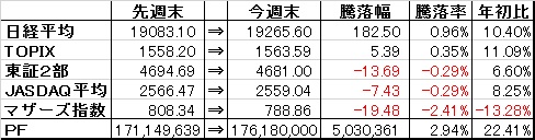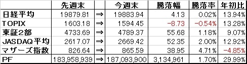 取引・なしPF(保有銘柄21銘柄+信用1銘柄)・1916 日成ビルド×20,000株 (@373) 時価368△3 [PBR1.34] [利回り3.80%]・2117 日新製糖×3,500株 (@2,100) 時価4,530△5 [PBR0.68] [利回り3.42%]・3123 サイボー×2,000株 (@511) 時価540±0 [PBR0.51] [利回り2.59%]・4247 ポバール興業×7,000株 (@1,135) 時価1,230△10 [PBR0.38] [利回り2.44%]・5484 東北特殊鋼×4,600株 (@1,315) 時価1,200△15 [PBR0.50] [利回り1.17%]・5698 エンビプロHD×10,000株 (@639) 時価753△2 [PBR0.62] [利回り3.32%]・6142 富士精工×32,000株 (@331) 時価363▼7 [PBR0.43] [利回り2.20%]・6365 電業社機械×3,000株 (@1,779) 時価1,881±0 [PBR0.53] [利回り3.19%]・6889 オーデリック×1,000株 (@3,140) 時価3,930△355 [PBR1.00] [利回り3.05%]・7175 今村証券×4,000株 (@1,415) 時価1,470▼19 [PBR0.54] [利回り0.51%]・7182 ゆうちょ銀行×3,000株 (@1,450) 時価1,718▼7 [PBR0.57] [利回り2.91%]・7314 小田原機器×3,500株 (@932) 時価1,103▼4 [PBR0.36] [利回り2.90%]・7485 岡谷鋼機×500株 (@7,060) 時価8,490▼10 [PBR0.47] [利回り1.88%]・7815 東京ボード×1,000株 (@1,310) 時価1,361△11 [PBR0.73] [利回り1.47%]・8045 横浜丸魚×13,000株 (@453) 時価532ケ [PBR0.29] [利回り1.88%]・8191 光製作所×32,000株 (@727) 時価842▼3 [PBR0.35] [利回り0.89%]・8596 九州リース×21,600株 (@388) 時価439▼2 [PBR0.47] [利回り1.71%]・9408 新潟放送×2,600株 (@635) 時価700▼7 [PBR0.31] [利回り1.07%] ・9680 共成レンテム×9,000株 (@1,040) 時価1,061▼16 [PBR0.56] [利回り1.89%] ・9866 マルキョウ×15,000株 (@489) 時価839△15 [PBR0.31] [利回り1.85%]・**** ****2,000株 (@***) 時価***▼* [PBR0.**] [利回り3.**%]信用買・7312 タカタ×10,000株 (@826) 時価849△2 [PBR0.51] [利回り-%] 【年間予想受取配当額】(税引前) 3,297,600-3,345,000円 (配当利回り2.12-2.15%)【年間受取確定配当額】(税引前) 2,441,550円株式 155,535,500円(83.1%)CP 31,558,400円(16.9%)合計 187,093,900円 ※5日連続で年初来最高値更新!【年初来最高値】187,093,900円(11/27)◎【年初来最低値】142,716,357円(1/14)前日比 △189,100円週次 △3,134,961円月次 △15,944,261円年次 △42,973,982円+配当2,441,550円(年初より△29.99%※配当含まず)☆今日のコメント☆「小幅ながら5日続伸」【保有銘柄動向】 日経平均株価は反落。保有銘柄はオーデリックが大幅高。マルキョウ、東北特殊鋼などもしっかり。反面、富士精工、共成レンテム、今村証券などが軟調に。PFは小幅ながら5日続伸。5日連続で年初来最高値更新。今週は全勝!!【今日の売買】 なし【今日の一言】 政府による白熱灯、蛍光灯の国内製造と国外輸入を2020年度をめどに実質的に禁止する方針との報道を受けてオーデリックが大幅高に。もともと指標面でも割安だったことから上昇率も大きかったが、今後特需も期待出来そうなことから保有継続へ。☆今週のコメント☆「4週連続上昇」 今週は+3,134,961円(+1.70%)と4週連続で上昇となった。今週はオーデリック、日新製糖が上昇が貢献。富士精工、マルキョウなども堅調に推移した。 来週は日経平均は2万円の大台手前で足踏みを想定。マザーズ指数、ジャスダック平均など小型株の上昇が続くか見極めて行きたい。※当ブログに掲載されているコメントは、あくまで個人的見解に基づくものであり、特定銘柄への投資を推奨するものではありません。また当ブログに書かれている事は100%正確であるとは限りません。くれぐれも投資は自己責任でお願い致します。