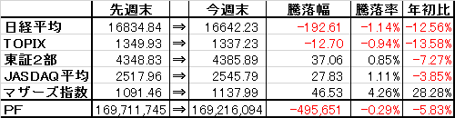 取引・【先物売建】・日経225mimi09×10枚 売建単価 16,425-16,430円・【先物返済】・日経225mimi09×10枚 返済単価 16,090-16,095円(売却益+333,680円)・【信用返済】・8316 三井住友FG×5,000株 返済単価 3,240円(売却益+476,292円)・【信用返済】・8591 オリックス×10,000株 返済単価 1,440円(売却益+449,595円)・【売却】・2185 シイエムシイ×1,100株 売却単価 2,630-2,632円(売却益+402,293円)・【売却】・7314 小田原機器×900株 売却単価 998-1,004円(売却益+59,849円)・【売却】・7485 岡谷鋼機×700株 売却単価 6,120-6,160円(売却損-574,965円)・【買付】・2788 アップル×3,000株 買付単価 238円PF(保有銘柄12銘柄)・2185 シイエムシイ×1,600→500株 (@2,270) 時価2,506▼124 [PBR0.53] [利回り3.39%]・2788 アップル×55,000→58,000株 (@278) 時価215▼28 [PBR0.44] [利回り-%]・3504 丸八HD×53,300株 (@760) 時価794▼4 [PBR0.26] [利回り3.78%]・5757 CKサンエツ×3,200株 (@961) 時価1,010▼30 [PBR0.34] [利回り1.98%]・5942 中西製作所×7,100株 (@600) 時価613▼5 [PBR0.34] [利回り2.45%]・7314 小田原機器×4,800→3,900株 (@952) 時価983▼10 [PBR0.31] [利回り3.05%]・8191 光製作所×37,000株 (@735) 時価755- [PBR0.31] [利回り0.99%]・8596 九州リース×30,000株 (@392) 時価400▼11 [PBR0.41] [利回り2.5043%]・8922 日本アセットM×150,000株 (@95) 時価94▼3 [PBR1.94] [利回り-%]・9408 新潟放送×2,600株 (@635) 時価583▼20 [PBR0.25] [利回り1.72%] ・9680 共成レンテム×13,000株 (@1,009) 時価877▼33 [PBR0.42] [利回り2.28%] ・9866 マルキョウ×12,000株 (@490) 時価670▼8 [PBR0.24] [利回り2.39%]【年間予想受取配当額】(税引前) 2,989,300円 (配当利回り2.10%)【年間受取確定配当額】(税引前) 1,902,650円株式 142,580,600円(87.9%)CP 19,664,613円(12.1%)合計 162,245,213円【年初来最高値】179,954,854円(1/4)【年初来最低値】142,618,614円(2/12)前日比 ▼4,267,817円週次 ▼2,623,297円月次 ▼8,139,186円年次 ▼17,445,241円+配当1,902,650円(年初より▼9.71%※配当含まず)☆今日のコメント☆「大幅続落」【保有銘柄動向】 日経平均株価は急落で4カ月半ぶりに年初来安値更新。下げ幅も歴代8位の大きさに。保有銘柄も全面安。アップルが10%を超える急落。シイエムシイ、共成レンテム、新潟放送、日本アセットMなど軒並み下落となり、PFは大幅続落。今年2月以来の大きい下げ幅となった。【今日の売買】(先物売買)万一のリスク回避のため先物をイブニングセッションで売建てしたが、10時頃に一旦急落し、戻る過程で利益確定してしまい大きく利益を逃す結果となり大失敗のトレードに。(信用返済)三井住友FGを返済売り。国民投票の先行きが不透明になりつつあったことからレバレッジの縮小と利益確定を優先。その後急落したためこちらは良い取引だった。(信用返済)オリックスを返済売り。こちらも国民投票の先行きが不透明になりつつあったことからレバレッジの縮小と利益確定を優先。こちらもその後急落したため良い取引だった。(売却)シイエムシイを一部売却。後場に入りイギリスのEU離脱が濃厚になったため、プラス圏だったシイエムシイを着実に利益確定へ。(売却)小田原機器を一部売却。こちらも後場に入りイギリスのEU離脱が濃厚になったため、プラス圏だった小田原機器を着実に利益確定へ。(売却)岡谷鋼機を売り切り。CP確保優先と市況悪化による業績の懸念から売却。売却損となった。(買付)アップルインターナショナルを買い増し。株価が軟調だったため買い増しも急激な円高が進行し株価も急落。安易な買いとなり大失敗。【今日の一言】 相場全体の波乱から取り合えず、レバレッジ解消+CP回復を優先。CPは12%まで回復出来たので、最低限の資金は確保。午前中に逃げれる時間があった事は幸運だった。☆今週のコメント☆「大幅続落」 今週は-2,623,297円(-1.59%)と大幅続落となった。週初めは堅調だったものの、金曜日の急落で一気にマイナスに転落。相場全体の軟調から保有株も軒並み軟調となった。ただレバレッジの圧縮、先物売りなどで損失は若干だがカバー出来た事は良かった。 来週は為替、先物、海外市場も落ち着きは取り戻しつつあるが、しばらくは値動きは大きくなりそう。とは言えかなり割安な銘柄水準まで売られた銘柄もあるため、土日で買い候補銘柄を絞り込んで、来週に備えて行きたい。※当ブログに掲載されているコメントは、あくまで個人的見解に基づくものであり、特定銘柄への投資を推奨するものではありません。また当ブログに書かれている事は100%正確であるとは限りません。くれぐれも投資は自己責任でお願い致します。