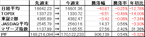 取引・なしPF(保有銘柄14銘柄)・2185 シイエムシイ×1,600株 (@2,263) 時価2,710△25 [PBR0.58] [利回り3.14%]・2788 アップル×55,000株 (@280) 時価270▼1 [PBR0.56] [利回り-%]・3504 丸八HD×53,300株 (@760) 時価809▼5 [PBR0.26] [利回り3.71%]・5757 CKサンエツ×3,200株 (@961) 時価1,074△14 [PBR0.36] [利回り1.86%]・5942 中西製作所×7,100株 (@600) 時価648△14 [PBR0.35] [利回り2.31%]・7314 小田原機器×4,800株 (@949) 時価1,020▼10 [PBR0.32] [利回り2.94%]・7485 岡谷鋼機×700株 (@6,957) 時価6,520▼40 [PBR0.42] [利回り2.61%]・7815 東京ボード×2,100株 (@1,080) 時価1,058- [PBR0.54] [利回り1.89%]・8191 光製作所×37,000株 (@735) 時価785- [PBR0.33] [利回り0.96%]・8596 九州リース×30,000株 (@392) 時価416▼2 [PBR0.43] [利回り2.40%]・8922 日本アセットM×100,000株 (@94) 時価106△2 [PBR2.18] [利回り-%]・9408 新潟放送×2,600株 (@635) 時価604- [PBR0.26] [利回り1.66%] ・9680 共成レンテム×13,000株 (@1,009) 時価941▼2 [PBR0.45] [利回り2.13%] ・9866 マルキョウ×12,000株 (@490) 時価685±0 [PBR0.25] [利回り2.34%]【年間予想受取配当額】(税引前) 3,255,800円 (配当利回り2.08%)【年間受取確定配当額】(税引前) 1,902,650円株式 156,310,300円(91.9%)CP 13,811,933円(8.1%)合計 170,122,233円【年初来最高値】179,954,854円(1/4)【年初来最低値】142,618,614円(2/12)前日比 △71,450円週次 △910,139円月次 ▼262,166円年次 ▼9,568,221円+配当1,902,650円(年初より▼5.32%※配当含まず)☆今日のコメント☆「小反発」【保有銘柄動向】 日経平均株価は小幅続落。保有銘柄はまちまち。中西製作所、JAM、CKサンエツなど低PER銘柄が堅調。反面、小田原機器、丸八HD、岡谷鋼機などが軟調に。PFは小反発へ。【今日の売買】 なし【今日の一言】 最近は銀行株、インバウンド、含み資産関連の銘柄の下落が目立つ展開。銀行株は高配当に関わらず株価は低迷。含み資産株も低金利の恩恵があるはずだが株価は低迷。絶好の投資チャンスなのか良く見極めた上でチャンスがあれば投資して行きたいところ。☆今週のコメント☆「6週ぶりに反発」 今週は△910,139円(△0.54%)と6週ぶりに反発となった。今週はアップルの買い増しのみと取引は殆どなかった。分割+増配の小田原機器が堅調。中西製作所、共成レンテム、シイエムシイなども堅調だった。 来週は日経平均株価先物が大きく下落しているが、個人的には下値は限定的と考え、四季報も発売されることから、四季報相場に期待しつつ、より良い銘柄の発掘に努めて行きたい。※当ブログに掲載されているコメントは、あくまで個人的見解に基づくものであり、特定銘柄への投資を推奨するものではありません。また当ブログに書かれている事は100%正確であるとは限りません。くれぐれも投資は自己責任でお願い致します。