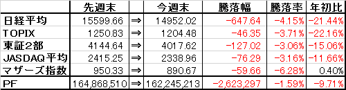 取引・なしPF(保有銘柄14銘柄)・2185 シイエムシイ×1,600株 (@2,263) 時価2,679▼1 [PBR0.57] [利回り3.17%]・2788 アップル×50,000株 (@281) 時価269△2 [PBR0.55] [利回り-%]・3504 丸八HD×53,300株 (@760) 時価811△8 [PBR0.26] [利回り3.70%]・5757 CKサンエツ×3,200株 (@961) 時価1,085ケ [PBR0.36] [利回り1.84%]・5942 中西製作所×7,100株 (@600) 時価626△4 [PBR0.34] [利回り2.40%]・7314 小田原機器×4,800株 (@949) 時価947△1 [PBR0.30] [利回り2.64%]・7485 岡谷鋼機×700株 (@6,957) 時価6,640▼30 [PBR0.43] [利回り2.56%]・7815 東京ボード×2,100株 (@1,080) 時価1,026▼10 [PBR0.52] [利回り1.95%]・8191 光製作所×37,000株 (@735) 時価781- [PBR0.33] [利回り0.96%]・8596 九州リース×30,000株 (@392) 時価425△6 [PBR0.44] [利回り2.35%]・8922 日本アセットM×100,000株 (@94) 時価104▼1 [PBR2.14] [利回り-%]・9408 新潟放送×2,600株 (@635) 時価605ケ [PBR0.26] [利回り1.65%] ・9680 共成レンテム×13,000株 (@1,009) 時価915▼1 [PBR0.44] [利回り2.19%] ・9866 マルキョウ×12,000株 (@490) 時価682▼3 [PBR0.25] [利回り2.35%]【年間予想受取配当額】(税引前) 3,231,800円 (配当利回り2.10%)【年間受取確定配当額】(税引前) 1,902,650円株式 154,072,500円(91.1%)CP 15,139,594円(8.9%)合計 169,212,094円【年初来最高値】179,954,854円(1/4)【年初来最低値】142,618,614円(2/12)前日比 △244,600円週次 ▼499,651円月次 ▼1,172,305円年次 ▼10,478,360円+配当1,902,650円(年初より▼5.83%※配当含まず)☆今日のコメント☆「3日ぶりに反発」【保有銘柄動向】 日経平均株価は3日ぶりに反発。保有銘柄はまちまち。九州リース、丸八HD、中西製作所、アップルなどが堅調も、岡谷鋼機、マルキョウ、東京ボードなどは軟調だった。PFは3日ぶりに小反発。【今日の売買】 なし【今日の一言】 PFの銘柄は小動きが続く。緩やかなジリ貧状態が続いているが、ここは我慢してじっくり保有して行きたい所。☆今週のコメント☆「5週連続下落」 今週は-499,651円(-0.29%)と5週連続の下落となった。今週は中本パックスを売却し、九州リース、アップル、丸八など割安な銘柄の買い増しを進めるなど、CPは維持しながらの取引が中心だった。 来週は日経平均株価先物が大きく下落しているため来週は下落で始まりそう。しばらくは様子を見ながらタイミングが合えば売買をして行きたいところ。※当ブログに掲載されているコメントは、あくまで個人的見解に基づくものであり、特定銘柄への投資を推奨するものではありません。また当ブログに書かれている事は100%正確であるとは限りません。くれぐれも投資は自己責任でお願い致します。