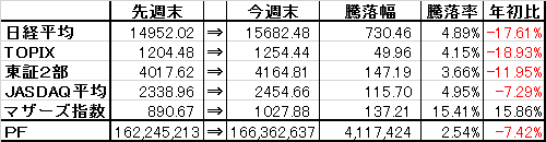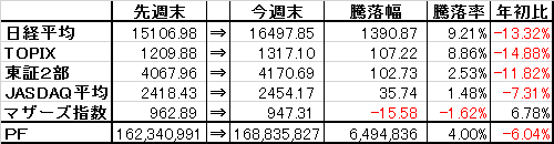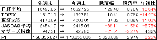 取引・なしPF(保有銘柄12銘柄+信用1銘柄)・2788 アップル×58,000株 (@278) 時価239▼3 [PBR0.49] [利回り-%]・3504 丸八HD×53,300株 (@760) 時価775▼9 [PBR0.25] [利回り3.87%]・5757 CKサンエツ×3,200株 (@961) 時価1,040△5 [PBR0.35] [利回り1.92%]・5918 瀧上工業×15,000株 (@411) 時価436△3 [PBR0.28] [利回り2.29%]・5942 中西製作所×7,100株 (@600) 時価663▼8 [PBR0.36] [利回り2.26%]・6889 オーデリック×1,500株 (@3,562) 時価3,735△25 [PBR0.90] [利回り3.75%]・7314 小田原機器×7,800株 (@476) 時価482△2 [PBR0.31] [利回り3.11%]・8191 光製作所×37,000株 (@735) 時価762ケ [PBR0.32] [利回り0.98%]・8596 九州リース×30,000株 (@392) 時価405△2 [PBR0.42] [利回り2.47%]・8922 日本アセットM×150,000株 (@95) 時価96▼1 [PBR1.98] [利回り-%]・9680 共成レンテム×13,000株 (@1,009) 時価924△13 [PBR0.44] [利回り2.16%] ・9866 マルキョウ×12,000株 (@490) 時価669- [PBR0.24] [利回り2.39%]信用買建・7553 ハピネット×5,000株 (@969) 時価1,001▼9 [PBR0.73] [利回り3.00%] ・8596 オリックス×17,000株 (@1,242) 時価1,460△39.5 [PBR0.83] [利回り3.42%] 先物売・日経225mimi09×1枚 売建単価 16,240円【年間予想受取配当額】(税引前) 3,276,800円 (配当利回り2.08%)【年間受取確定配当額】(税引前) 1,902,650円株式 157,652,800円(93.4%)CP 11,183,027円(6.6%)合計 168,835,827円【年初来最高値】179,954,854円(1/4)【年初来最低値】142,618,614円(2/12)前日比 △121,636円週次 △6,494,836円月次 △3,487,535円年次 ▼10,854,627円+配当1,902,650円(年初より▼6.04%※配当含まず)☆今日のコメント☆「5日続伸」【保有銘柄動向】 日経平均株価は5日続伸。保有銘柄はオリックス、共成レンテム、オーデリック、瀧上工業などを中心に堅調。反面、アップル、丸八HD、ハピネット、中西製作所、日本アセットMが軟調に。PFは小幅ながら5日続伸。【今日の売買】 なし【今日の一言】 日経平均、任天堂の上昇が続く展開。任天堂は昔何度か買った銘柄だけにこういう時に持ってないとは少し残念な気も。☆今週のコメント☆「大幅反発」 今週は+6,494,836円(+4.00%)と大幅反発となったが、日経平均、TOPIXの上昇には及ばなかった。保有銘柄ではオリックスの上昇が貢献。中西製作所、オーデリックなども堅調だったが、銘柄によって温度差がある相場展開だった。 来週はこのまま引き続き堅調な地合いが続くかどうかが注目されるところ。引き続き為替次第とは思うが、ポケモン関連銘柄の活況など個別銘柄の物色意欲は強いと思われるため、銘柄開拓に注視して行きたい。※当ブログに掲載されているコメントは、あくまで個人的見解に基づくものであり、特定銘柄への投資を推奨するものではありません。また当ブログに書かれている事は100%正確であるとは限りません。くれぐれも投資は自己責任でお願い致します。