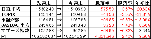 取引・【信用返済】・8792 ソニーFHD×5,000株 返済単価 1,065円(売却損-140,590円)・【信用買付】・8596 オリックス×2,000株 買建単価 1,253-1,263円PF(保有銘柄12銘柄+信用1銘柄)・2788 アップル×58,000株 (@278) 時価233△2 [PBR0.48] [利回り-%]・3504 丸八HD×53,300株 (@760) 時価770△5 [PBR0.25] [利回り3.90%]・5757 CKサンエツ×3,200株 (@961) 時価1,013▼3 [PBR0.34] [利回り1.97%]・5918 瀧上工業×15,000株 (@411) 時価422▼2 [PBR0.27] [利回り2.37%]・5942 中西製作所×7,100株 (@600) 時価618△5 [PBR0.34] [利回り2.43%]・6889 オーデリック×1,500株 (@3,562) 時価3,580▼10 [PBR0.86] [利回り3.91%]・7314 小田原機器×7,800株 (@476) 時価476- [PBR0.30] [利回り3.15%]・8191 光製作所×37,000株 (@735) 時価740- [PBR0.31] [利回り1.01%]・8596 九州リース×30,000株 (@392) 時価405±0 [PBR0.42] [利回り2.47%]・8922 日本アセットM×150,000株 (@95) 時価94▼1 [PBR1.94] [利回り-%]・9680 共成レンテム×13,000株 (@1,009) 時価908- [PBR0.44] [利回り2.20%] ・9866 マルキョウ×12,000株 (@490) 時価674ケ [PBR0.24] [利回り2.37%]信用買建・8596 オリックス×15,000→17,000株 (@1,242) 時価1,251▼13 [PBR0.71] [利回り4.00%] 【年間予想受取配当額】(税引前) 3,276,800円 (配当利回り2.16%)【年間受取確定配当額】(税引前) 1,902,650円株式 151,158,700円(93.1%)CP 11,182,291円(6.9%)合計 162,340,991円【年初来最高値】179,954,854円(1/4)【年初来最低値】142,618,614円(2/12)前日比 ▼766,390円週次 ▼4,021,646円月次 ▼3,007,301円年次 ▼17,349,463円+配当1,902,650円(年初より▼9.66%※配当含まず)☆今日のコメント☆「3日続落」【保有銘柄動向】 日経平均株価は4日続落。保有銘柄はまちまち。アップル、丸八HD、中西製作所は上昇も、オリックス、日本アセットM、瀧上工業などが軟調に。保有株数の多い光製作所、共成レンテムの下落が響き、PFは3日続落に。【今日の売買】(信用返済)ソニーフィナンシャルグループを返済売り。今日の株価の動きを見て動きが非常に弱く、さらに下落した時に買い増しするか考えた結果、買い増し出来ない結論に達したため一旦売却して仕切り直し。損益は-140,590円と1日の勉強代としては痛い出費だった。(信用買い)オリックスを信用買い増し。ソニーFHDの清算で余力が回復したことから買い増しへ。【今日の一言】 現在のレバレッジは1.13倍。上限は1.2~1.25倍までに設定。想定外の大幅下落になった際、信用ポジションの清算を迫られた時にも対処出来るよう1000万円のCPは維持したい。☆今週のコメント☆「大幅反落」 今週は-4,021,646円(-2.42%)と大幅反落となり先週の上昇分を吐き出した格好。オリックスの下落や、丸八HD、日本アセットM、光製作所など保有株数の多い銘柄の下落が響いた。反面、アップル、中西製作所、オーデリックなどは底堅く推移した。 来週は為替次第だが株価の下落余地は徐々に小さくなりつつあると思われる。PFはレバレッジが掛かってる状態のためリスクには細心の注意を払って行きたい。※当ブログに掲載されているコメントは、あくまで個人的見解に基づくものであり、特定銘柄への投資を推奨するものではありません。また当ブログに書かれている事は100%正確であるとは限りません。くれぐれも投資は自己責任でお願い致します。
