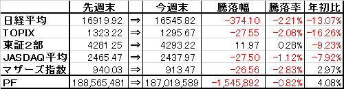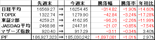 取引・なしPF(保有銘柄12銘柄)・2788 アップル×58,000株 (@278) 時価221▼3 [PBR0.41] [利回り-%]・3504 丸八HD×53,300株 (@760) 時価782▼6 [PBR0.28] [利回り3.84%]・4686 ジャストシステム×5,000株 (@831) 時価830▼2 [PBR1.61] [利回り0.72%]・5941 中西製作所×7,100株 (@600) 時価664▼14 [PBR0.37] [利回り2.26%]・6889 オーデリック×1,500株 (@3,562) 時価3,630▼45 [PBR0.87] [利回り3.86%]・7314 小田原機器×7,800株 (@476) 時価496▼4 [PBR0.32] [利回り3.02%]・8191 光製作所×37,000株 (@735) 時価801ケ [PBR0.33] [利回り0.94%]・8591 オリックス×15,000株 (@1,240) 時価1,439.5▼4 [PBR0.81] [利回り3.47%] ・8596 九州リース×30,000株 (@392) 時価415±0 [PBR0.42] [利回り2.41%]・8922 日本アセットM×150,000株 (@95) 時価97△1 [PBR1.36] [利回り-%]・9760 進学会×10,000株 (@474) 時価499▼8 [PBR0.37] [利回り3.01%]・9866 マルキョウ×12,000株 (@490) 時価946±0 [PBR0.34] [利回り1.69%]【年間予想受取配当額】(税引前) 3,736,800-3,801,800円 (配当利回り2.23-2.27%)【年間受取確定配当額】(税引前) 1,902,650円株式 167,381,500円(89.5%)CP 19,638,089円(10.5%)合計 187,019,589円【年初来最高値】188,724,581円(8/10)【年初来最低値】142,618,614円(2/12)前日比 ▼693,900円週次 ▼1,545,892円月次 △92,266円年次 △7,329,135円+配当1,902,650円(年初より△4.08%※配当含まず)☆今日のコメント☆「続落」【保有銘柄動向】 日経平均株価は反発。新興市場はまちまち。一方、保有銘柄は軟調な銘柄が多く、中西製作所、進学会、アップル、オーデリック、小田原機器、丸八HDなどが軟調に。反面、上昇は日本アセットMのみに留まり、PFは続落と軟調に。【今日の売買】 なし【今日の一言】 今日は持ち株は全体的に不調に。柱になるような銘柄が欲しいところ。☆今週のコメント☆「大幅反落」 今週は-1,545,892円(-0.82%)と大幅反落となった。今週は瀧上工業、CKサンエツを売却の一方で、進学会、ジャストシステムを購入するなど、CPを高めながら銘柄の入れ替えを実施。持ち株は全般的に不調な銘柄が多く、オーデリック、アップル、丸八HDなど軟調だった。 来週は為替の円高がどの水準で止まるのかが意識されるところ。騰落レシオは徐々に低下しており、為替が落ち着けば上昇余地はあると思うが、相場の先行きを読むのが難しいため最低限のCPは維持して行きたい。※当ブログに掲載されているコメントは、あくまで個人的見解に基づくものであり、特定銘柄への投資を推奨するものではありません。また当ブログに書かれている事は100%正確であるとは限りません。くれぐれも投資は自己責任でお願い致します。