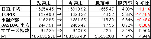 取引・なしPF(保有銘柄12銘柄)・2788 アップル×60,000株 (@276) 時価238△7 [PBR0.44] [利回り-%]・3504 丸八HD×53,300株 (@760) 時価789△5 [PBR0.28] [利回り3.80%]・4686 ジャストシステム×5,000株 (@831) 時価872△3 [PBR1.69] [利回り0.69%]・5941 中西製作所×7,100株 (@600) 時価661△11 [PBR0.37] [利回り2.27%]・6889 オーデリック×1,500株 (@3,562) 時価3,615△5 [PBR0.87] [利回り3.87%]・7314 小田原機器×7,800株 (@476) 時価489▼18 [PBR0.31] [利回り3.07%]・8191 光製作所×37,000株 (@735) 時価801ケ [PBR0.33] [利回り0.94%]・8591 オリックス×15,000株 (@1,240) 時価1,409.5▼2 [PBR0.79] [利回り3.55%] ・8596 九州リース×30,000株 (@392) 時価414△2 [PBR0.42] [利回り2.42%]・8922 日本アセットM×180,000株 (@96) 時価104△4 [PBR1.45] [利回り-%]・9760 進学会×10,000株 (@474) 時価496△3 [PBR0.37] [利回り3.02%]・9866 マルキョウ×12,000株 (@490) 時価970△10 [PBR0.35] [利回り1.65%]【年間予想受取配当額】(税引前) 3,736,800-3,801,800円 (配当利回り2.16-2.19%)【年間受取確定配当額】(税引前) 1,902,650円株式 173,276,600円(91.4%)CP 16,281,235円(8.6%)合計 189,557,835円 ※8/10以来、年初来最高値更新!【年初来最高値】189,557,835円(8/25)◎【年初来最低値】142,618,614円(2/12)前日比 △1,547,100円週次 △2,538,246円月次 △2,630,512円年次 △9,867,381円+配当1,902,650円(年初より△5.49%※配当含まず)☆今日のコメント☆「大幅続伸で年初来最高値更新!」【保有銘柄動向】 日経平均株価は小反落。保有銘柄はオリックス、小田原機器が下落も、日本アセットM、アップル、丸八HD、中西製作所など堅調な銘柄が多く、PFは大幅続伸。8/10以来、ほぼ2週間ぶりに年初来最高値更新へ!【今日の売買】 なし【今日の一言】 日本アセットM、アップルなど直近買い増しした銘柄中心に堅調。年初来+1000万円到達まであと少し!※当ブログに掲載されているコメントは、あくまで個人的見解に基づくものであり、特定銘柄への投資を推奨するものではありません。また当ブログに書かれている事は100%正確であるとは限りません。くれぐれも投資は自己責任でお願い致します。