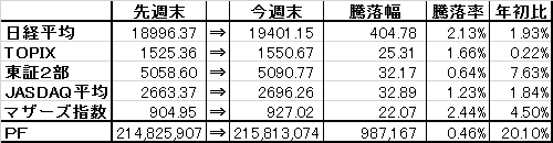 取引・なしPF(保有銘柄13銘柄)・1716 第一カッター×3,000株 (@1,000) 時価1,040±0 [PER7.2][PBR0.81] ・1949 住友電設×5,000株 (@1,059) 時価1,286△5 [PER8.8][PBR0.87]・2788 アップル×60,000株 (@276) 時価265△1 [PER4.7][PBR0.48]・3504 丸八HD×62,000株 (@762) 時価815△13 [PER12.9][PBR0.29]・3537 昭栄薬品×2,000株 (@1,760) 時価1,933▼27 [PER9.6][PBR0.40]・5941 中西製作所×7,100株 (@600) 時価994△20 [PER5.9][PBR0.52]・7314 小田原機器×7,800株 (@476) 時価547±0 [PER13.2][PBR0.34]・8191 光製作所×37,000株 (@735) 時価843ケ [PER10.3][PBR0.35]・8596 九州リース×30,900株 (@393) 時価628△10 [PER6.4][PBR0.62]・8922 日本アセットM×180,000株 (@96) 時価138±0 [PER3.4][PBR1.72]・9035 第一交通産業×5,100株 (@1,100) 時価1,280△3 [PER5.0][PBR0.61] ・9852 CBグループM×10,000株 (@481) 時価543△8 [PER6.2][PBR0.34] ・9866 マルキョウ×12,000株 (@490) 時価1,082±0 [PER16.2][PBR0.38]【年間予想受取配当額】(税引前) 3,313,900-3,375,700円 (配当利回り1.73-1.76%)【年間受取確定配当額】(税引前) 2,495,050円株式 191,713,000円(87.7%)CP 26,771,874円(12.3%)合計 218,484,874円 ※3日連続で年初来最高値更新!【年初来最高値】218,484,874円(12/20)◎【年初来最低値】142,618,614円(2/12)前日比 △1,386,100円週次 △2,671,800円月次 △6,446,626円年次 △38,797,420円+配当2,495,050円(年初より△21.59%※配当含まず)☆今日のコメント☆「大幅に3日続伸」【保有銘柄動向】 日経平均株価は反発。新興市場も今日は揃って上昇に。保有銘柄は中西製作所が連日で年初来高値更新。九州リース、丸八HD、CBグループなども堅調に。反面、下落は昭栄薬品のみに留まり、PFは大幅に3日続伸。3日連続で年初来最高値更新へ!【今日の売買】 なし【今日の一言】 相場全体の堅調続き、日経平均の騰落レシオは152.32と150超えが続く展開。出遅れ気味の割安株も堅調で相場の息が長くなる可能性も。※当ブログに掲載されているコメントは、あくまで個人的見解に基づくものであり、特定銘柄への投資を推奨するものではありません。また当ブログに書かれている事は100%正確であるとは限りません。くれぐれも投資は自己責任でお願い致します。