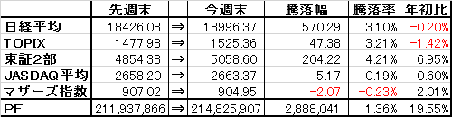 取引・【先物清算】・日経平均225mimi12×10枚 (売却損-1,627,860円)PF(保有銘柄13銘柄)・1716 第一カッター×3,000株 (@1,000) 時価1,050△3 [PER7.3][PBR0.82] ・1949 住友電設×5,000株 (@1,059) 時価1,272△8 [PER8.7][PBR0.86]・2788 アップル×60,000株 (@276) 時価259±0 [PER4.6][PBR0.47]・3504 丸八HD×60,000株 (@760) 時価795▼3 [PER12.6][PBR0.28]・3537 昭栄薬品×2,000株 (@1,760) 時価1,952△53 [PER9.7][PBR0.40]・5941 中西製作所×7,100株 (@600) 時価966△33 [PER5.7][PBR0.51]・7314 小田原機器×7,800株 (@476) 時価535±0 [PER12.9][PBR0.34]・8191 光製作所×37,000株 (@735) 時価830- [PER10.1][PBR0.34]・8596 九州リース×30,900株 (@393) 時価630△1 [PER6.4][PBR0.62]・8922 日本アセットM×180,000株 (@96) 時価134△4 [PER3.3][PBR1.67]・9035 第一交通産業×5,100株 (@1,100) 時価1,206△11 [PER4.7][PBR0.58] ・9852 CBグループM×10,000株 (@481) 時価546▼2 [PER6.3][PBR0.34] ・9866 マルキョウ×12,000株 (@490) 時価1,062▼1 [PER15.9][PBR0.38]【年間予想受取配当額】(税引前) 3,253,900円 (配当利回り1.74%)【年間受取確定配当額】(税引前) 2,495,050円株式 186,499,600円(86.8%)CP 28,326,307円(13.2%)合計 214,825,907円【年初来最高値】215,803,267円(12/8)【年初来最低値】142,618,614円(2/12)前日比 ▼977,360円週次 △2,888,041円月次 △2,787,659円年次 △35,135,453円+配当2,495,050円(年初より△19.55%※配当含まず)☆今日のコメント☆「6日ぶりに反落」【保有銘柄動向】 日経平均株価は大幅に4日続伸。保有銘柄は引き続き堅調な銘柄が多く、日本アセットM、中西製作所が年初来最高値更新。昭栄薬品、第一交通、住友電設なども堅調に推移。反面、丸八HD、CBグループ、マルキョウが軟調に。先物売りの清算損が響き、PFは6日ぶりに反落へ。【今日の売買】(先物清算)SQにより清算。損失は-1,627,860円と先日の先物の利益を上回る損失となり大失敗トレードに。【今日の一言】 先物の清算で今日はマイナス。無ければ連日高値更新だっただけに残念な結果に。☆今週のコメント☆「5週連続上昇へ」 今週は+2,888,041円(+1.36%)と5週連続で上昇となった。持ち株は日本アセットM、中西製作所、昭栄薬品、住友電設、第一カッターなどが堅調に推移。取引はオーデリックを売却、昭栄薬品を新規に購入。先物の清算損が大きく足を引っ張った。 来週はさすがに高値警戒感もあり、ここからの購入はリスクが高そう。大きく上昇した銘柄には利益確定を入れて行きたい。※当ブログに掲載されているコメントは、あくまで個人的見解に基づくものであり、特定銘柄への投資を推奨するものではありません。また当ブログに書かれている事は100%正確であるとは限りません。くれぐれも投資は自己責任でお願い致します。
