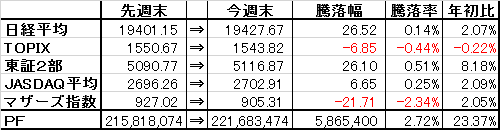 取引・なしPF(保有銘柄13銘柄)・1716 第一カッター×3,000株 (@1,000) 時価999▼1 [PER6.9][PBR0.78] ・1949 住友電設×5,000株 (@1,059) 時価1,232△3 [PER8.4][PBR0.84]・2788 アップル×60,000株 (@276) 時価257±0 [PER4.6][PBR0.47]・3504 丸八HD×60,000株 (@760) 時価793△1 [PER12.5][PBR0.28]・5941 中西製作所×7,100株 (@600) 時価913▼18 [PER5.4][PBR0.48]・6889 オーデリック×1,500株 (@3,562) 時価3,920▼5 [PER6.9][PBR0.91]・7314 小田原機器×7,800株 (@476) 時価526▼6 [PER12.7][PBR0.33]・8191 光製作所×37,000株 (@735) 時価825ケ [PER10.0][PBR0.34]・8596 九州リース×30,900株 (@393) 時価630▼8 [PER6.4][PBR0.62]・8922 日本アセットM×180,000株 (@96) 時価122△2 [PER3.0][PBR1.52]・9035 第一交通産業×5,100株 (@1,100) 時価1,195△7 [PER4.6][PBR0.57] ・9852 CBグループM×10,000株 (@481) 時価531△16 [PER6.1][PBR0.33] ・9866 マルキョウ×12,000株 (@490) 時価1,054±0 [PER15.8][PBR0.37]【先物売】・日経平均225mimi12×10枚 (@17,240)【年間予想受取配当額】(税引前) 3,383,900円 (配当利回り1.83%)【年間受取確定配当額】(税引前) 2,495,050円株式 184,776,600円(87.2%)CP 27,145,266円(12.8%)合計 211,921,866円【年初来最高値】212,043,448円(11/29)【年初来最低値】142,618,614円(2/12)前日比 △200,400円週次 △1,414,118円月次 ▼116,382円年次 △32,231,412円+配当2,495,050円(年初より△17.94%※配当含まず)☆今日のコメント☆「3日ぶりに反発」【保有銘柄動向】 日経平均株価は3日ぶりに反落。新興市場も軒並み下落に。保有銘柄はまちまち。CBグループ、日本アセットM、第一交通、住友電設、丸八HDが堅調。反面、中西製作所、九州リース、小田原機器、オーデリック、第一カッターは軟調となったが、PFは3日ぶりに反発へ。【今日の売買】 なし【今日の一言】 相場は流石に一服感も保有銘柄は売買の決め手に欠く状況。CPを高めて行きたいところだが、なかなか売却タイミングが掴みにくい展開が続く。☆今週のコメント☆「4週連続上昇へ」 今週は+1,414,118円(+0.67%)と4週連続で上昇となった。取引は安田倉庫を売却したのみ。保有銘柄では丸八HD、日本アセットM、光製作所、住友電設を中心に堅調。反面、九州リース、小田原機器は軟調だった。 来週はSQを控え株価も大きく動く可能性も。ヘッジ売り分の先物は損失になる事はほぼ確定しているため、何時決済するか悩みどころ。※当ブログに掲載されているコメントは、あくまで個人的見解に基づくものであり、特定銘柄への投資を推奨するものではありません。また当ブログに書かれている事は100%正確であるとは限りません。くれぐれも投資は自己責任でお願い致します。