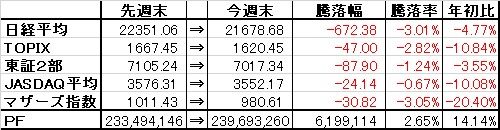 取引・【損失確定クロス】・ケーエフシー、ASTI、マブチ、ニッピ、オリックス、ソフトバンクG、ミクシィ、三菱地所、ユニゾHD、ジェコス(確定損-5,468,986円)・【買い増し】・9984 ソフトバンクグループ×500株 買付単価 7,651円・【信用買い】・9984 ソフトバンクグループ×500株 買付単価 7,510円PF(保有銘柄16銘柄)【現物】・2121 ミクシー×2,000株 (@2,140) 時価2,174▼42 [PER6.1][PBR0.97]・3258 ユニゾHD×5,000株 (@2,025) 時価2,027▼83 [PER6.7][PBR0.22*]・3420 ケーエフシー×3,000株 (@1,931) 時価1,937▼121 [PER8.4][PBR1.06]・3504 丸八HD×33,500株 (@767) 時価787▼54 [PER11.5][PBR0.27]・3537 昭栄薬品×6,000株 (@567) 時価1,032▼26 [PER12.3][PBR0.44]・4298 プロト×6,800株 (@1,409) 時価1,395▼63 [PER9.4][PBR1.04]・6592 マブチモーター×10,000株 (@3,340) 時価3,395▼85 [PER9.7][PBR0.92]・6899 ASTI×3,000株 (@1,726) 時価1,777▼13 [PER4.7][PBR0.36]・7932 ニッピ×2,700株 (@2,929) 時価2,965▼34 [PER21.3][PBR0.22*]・8191 光製作所×6,000株 (@3,770) 時価6,610▼10 [PER13.1][PBR0.50]・8591 オリックス×5,000株 (@1,543) 時価1,545.5▼68.5 [PER6.1][PBR0.71] ・8802 三菱地所×18,000株 (@1,746) 時価1,740.0▼78.0 [PER19.6][PBR0.47*]・9852 CBグループM×2,000株 (@2,403) 時価2,903▼53 [PER4.8][PBR0.32]・9984 ソフトバンクG×2,500→3,000株 (@7,510) 時価7,621▼177 [PER10.2][PBR1.42]・9991 ジェコス×5,000株 (@1,001) 時価1,008▼22 [PER8.2][PBR0.72]【制度信用買】・7242 KYB×2,000株 (@2,891) 時価2,521△3 [PER-][PBR0.39]・9984 ソフトバンクG×0→500株 (@7,510) 時価7,621▼177 [PER10.2][PBR1.42]【年間予想受取配当額】(税引前) 5,463,000-5,513,000円 (配当利回り2.46-2.48%)【年間受取確定配当額】(税引前) 3,997,300円株式 222,348,440円(99.6%)CP 1,003,990円(0.4%)合計 223,352,430円【年初来最高値】242,508,205円(12/4)【年初来最低値】210,000,000円(1/1)前日比 ▼6,740,950円週次 ▼14,659,480円月次 ▼10,141,716円年次 △13,352,430円+配当3,997,300円(年初より△6.36%※配当含まず)☆今日のコメント☆「大幅に6日続落」【保有銘柄動向】 日経平均株価は4日続落で連日で年初来安値更新。新興市場も大幅続落で揃って年初来安値更新に。保有銘柄も連日壊滅状態。KYBのみ小幅高以外は全銘柄下落と軟調。PFは6日続落。6日間での下落幅は1512万円に。【今日の売買】(損失確定クロス)ケーエフシー、ASTI、マブチ、ニッピ、オリックス、ソフトバンクG、ミクシィ、三菱地所、ユニゾHD、ジェコスを損失確定クロス。確定損は-5,468,986円となった。(買い増し+制度信用買い)ソフトバンクGを5日連続で買い増し。新規上場してソフトバンクの株価はようやく反発となったことや、保有株の含み益から考えても株価は非常に割安な事。225採用銘柄のため指数先物に伴う売りもあり、株価は必要以上に売り込まれていると判断。現物買い+信用買いへ。【今日の一言】 連日株価は大幅安。さすがに売られ過ぎと判断して久し振りの信用買い。レバレッジは1.04倍。今後株価の下落が続くようなら1.2倍を上限に信用買いを検討。☆今週のコメント☆「大幅続落」 今週は14,659,480円(-6.16%)と大幅続落となった。指数の下落率と比較するとPFの下落率は少なかったがそれでも大打撃の1週間だった。小幅に留まった。今週は大石産業、KDDI、三尾地所を一部売却の一方で、ソフトバンクG、ASTI、ニッピを買い増しへ。保有銘柄は全面安。特にジェコス、オリックス、丸八HD、三菱地所、ソフトバンクGの下落が目立った。 来週は日経平均先物の価格が下落していることから軟調なスタートとなりそうだが、テクニカル的には売られ過ぎの水準のためキッカケさえあれば下げ止まりから反発する可能性も高いと思われる。厳しい市場環境が続くことを想定してより厳格なリスク管理を徹底して行きたい。※PBRの後ろに※表記がある銘柄は、賃貸用不動産等を期末時価に評価し直した数値となります。※当ブログに掲載されているコメントは、あくまで個人的見解に基づくものであり、特定銘柄への投資を推奨するものではありません。また当ブログに書かれている事は100%正確であるとは限りません。くれぐれも投資は自己責任でお願い致します。