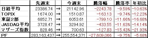 取引・【信用買い】・9020 東日本旅客鉄道×1,000株 買付単価8,297.0円・【信用買い】・8802 三菱地所×2,000株 買付単価1,860.0円・【売却】・4365 松本油脂製薬×400株 売却単価 11,210円(売却益+260,408円)・【OP売】・日経225OP15,000PUT×4枚 売建単価 185.0-225.0円PF(保有銘柄21→20銘柄)【現物】・2221 岩塚製菓×3,000株 (@3,762) 時価3,795▼55 [PER12.5][PBR0.34]・3001 片倉工業×10,000株 (@1,253) 時価1,241▼25 [PER19.8][PBR0.28*]・3254 プレサンス×20,000株 (@1,070) 時価1,140▼25 [PER3.3][PBR0.64]・3504 丸八HD×33,500株 (@767) 時価767▼4 [PER20.4][PBR0.26]・3537 昭栄薬品×6,000株 (@567) 時価971▼58 [PER14.9][PBR0.41]・5444 大和工業×4,000株 (@2,662→2,368) 時価2,260▼123 [PER10.8][PBR0.48]・6362 石井鐵工所×6,500株 (@2,303) 時価2,469▼205 [PER15.2][PBR0.30*]・6396 宇野澤組鐵工所×3,000株 (@2,120) 時価3,265▼185 [PER180.4][PBR0.33*]・7485 岡谷鋼機×1,000株 (@9,376) 時価9,000▼450 [PER5.4][PBR0.40]・7932 ニッピ×3,000株 (@3,987→2,930) 時価3,450▼230 [PER7.9][PBR0.24*]・8293 ATグループ×6,000株 (@1,764) 時価1,556▼80 [PER6.5][PBR0.25]・8591 オリックス×10,000株 (@1,623→1,533) 時価1,745.0▼59.0 [PER7.5][PBR0.74] ・9022 東海旅客鉄道×1,000株 (@22,181→19,443) 時価17,780.0▼660.0 [PER8.2][PBR0.91]・9699 西尾レントオール×4,000株 (@2,894→2,772) 時価2,654▼74 [PER7.4][PBR0.76]・9708 帝国ホテル×10,000株 (@1,936) 時価1,949▼14 [PER31.2][PBR0.84*]・9734 精養軒×10,000株 (@901) 時価1,001▼31 [PER29.6][PBR0.35*]・9852 CBグループM×2,000株 (@2,406) 時価2,410▼98 [PER7.6][PBR0.26]・9984 ソフトバンクG×4,500株 (-) 時価5,013.0▼226.0 [PER8.7][PBR0.40*]【信用】・8802 三菱地所×5,000→7,000株 (@1,948) 時価1,844.0▼107.5 [PER18.4][PBR0.45*]・9020 東日本旅客鉄道×4,000→5,000株 (@8,595) 時価8,319.0▼209.0 [PER11.8][PBR0.66*] ※ほか株主優待目的で35→36銘柄保有【年間予想受取配当額】(税引前) 5,772,000-5,782,000円 (配当利回り2.25%)【年間受取確定配当額】(税引前) 120,000円株式 242,398,200円(94.9%)CP 13,156,171円(5.1%)合計 255,554,371円 ※連日で年初来最低値更新!【年初来最高値】290,545,487円(2/12)【年初来最低値】255,554,371円(2/28)●前日比 ▼9,985,235円※過去最大の下落幅!週次 ▼27,609,056円+配当120,000円月次 ▼18,094,660円+配当120,000円年次 ▼15,393,641円+配当120,000円(年初より▼5.68%※配当含まず)☆今日のコメント☆「大幅4日続落で過去最大の下落幅!」【保有銘柄動向】 日経平均株価は急落で5日連続下落。保有銘柄も前日に続き上昇銘柄なしと壊滅状態。三菱地所、JR東日本、東海、オリックス、ソフトバンクGなどの大型株がいずれも大幅安。丸八HD、帝国ホテルなどネットネット株、含み資産株の一部は比較的小さい下落で済んだものの、PFは大幅に4日続落で過去最大の下落幅に沈んだ。【今日の売買】(信用買い)JR東日本を信用買い増し継続。連日株価は大きく下落しているため買い増し継続。(信用買い)三菱地所を信用買い増し。こちらも連日株価は大きく下落しているため買い増し継続。(売却)松本油脂製薬を売り切り。相場全体が急落する中で、信用ポジションが拡大する中でCPの比率20%を維持するため売り切りへ。売却益は+260,408円となったが、換金売り状態と完全に資金管理ミスによる取引となり反省。(OP売り)・日経225OP15,000PUTを売り。IVが100を超える異常なボラの中、SQの3/13に日経平均の権利行使価格15,000円のオプションが200円近いのはさすがにあり得ないと判断してPUT売りへ。ただし資金量も限りがあるため4枚までに留めた。【今日の一言】 JR東日本、三菱地所を信用買い継続。松本油脂を売却。PFのレバレッジは1.22倍。騰落レシオは53.31まで低下。正直ここまでの下落は想定(-5σ以上)出来なかった。15,000のPUT4枚だけ売り。☆今週のコメント☆「過去最大の下落幅に」 今週は-27,609,056円+配当120,000円(-9.75%)と過去最大の下落幅となった。木曜日以降の資金管理を完全にミスしたため木金の下落幅は非常に大きかったものの、週間下落率で見ると日経平均並みの下落率で留まったのは不幸中の幸い。今週はJR東日本、三菱地所を信用買い。一方で松本油脂製薬を換金売りへ。保有銘柄は全面安の展開だった。 来週もVIX指数はリーマンショック以来の高い水準となっており、しばらくは乱高下が続きそう。ただ必ずいつかはコロナショックは沈静化することから、そのタイミングを見極めつつ資金管理にも留意しながらポジションを維持して行きたい。※PBRの後ろに*表記がある銘柄は、賃貸用不動産等の含み益を加味した税引前の実質PBRの数値です。※取得単価に→があるものは、節税クロス前の単価→節税クロス後の単価となります。※当ブログに掲載されているコメントは、あくまで個人的見解に基づくものであり、特定銘柄への投資を推奨するものではありません。また当ブログに書かれている事は100%正確であるとは限りません。くれぐれも投資は自己責任でお願い致します。