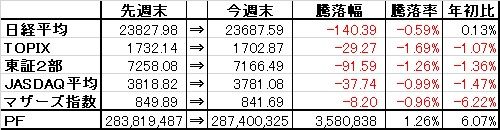 取引・【売却】・9984 ソフトバンクG×1,500株 売却単価 5,595-5,699円(売却益+1,536,754円)・【品受け】・9708 帝国ホテル×10,000株PF(保有銘柄19銘柄)【現物】・2221 岩塚製菓×3,000株 (@3,758) 時価4,105△5 [PER13.5][PBR0.37]・3001 片倉工業×10,000株 (@1,253) 時価1,321▼11 [PER21.1][PBR0.29*]・3254 プレサンス×20,000株 (@1,070) 時価1,273▼4 [PER3.7][PBR0.72]・3504 丸八HD×33,500株 (@767) 時価797±0 [PER21.2][PBR0.27]・3537 昭栄薬品×6,000株 (@567) 時価1,084△3 [PER16.6][PBR0.46]・4365 松本油脂製薬×900株 (@10,508) 時価12,280△10 [PER10.2][PBR0.73]・5444 大和工業×4,000株 (@2,662→2,583) 時価2,501△2 [PER11.9][PBR0.54]・6362 石井鐵工所×6,500株 (@2,303) 時価2,898△37 [PER17.8][PBR0.35*]・6396 宇野澤組鐵工所×3,000株 (@2,126) 時価3,650△50 [PER201.7][PBR0.37*]・7485 岡谷鋼機×1,000株 (@9,370) 時価9,870▼60 [PER5.9][PBR0.44]・7932 ニッピ×3,000株 (@3,987→2,929) 時価4,040▼45 [PER9.3][PBR0.29*]・8293 ATグループ×6,000株 (@1,764) 時価1,718▼19 [PER7.2][PBR0.28]・8591 オリックス×10,000株 (@1,623→1,546) 時価1,911.0▼14.0 [PER8.2][PBR0.81] ・9022 東海旅客鉄道×1,000株 (@22,181→20,505) 時価20,690▼35 [PER9.5][PBR1.06]・9699 西尾レントオール×4,000株 (@2,894) 時価2,920▼6 [PER8.2][PBR0.84]・9708 帝国ホテル×10,000株 (@1,936) 時価1,974△43 [PER31.6][PBR0.85*]・9734 精養軒×10,000株 (@900) 時価1,104▼4 [PER32.6][PBR0.38*]・9852 CBグループM×2,000株 (@2,403) 時価2,629▼2 [PER8.3][PBR0.28]・9984 ソフトバンクG×6,000→4,500株 (恩株) 時価5,664.0△133.0 [PER9.8][PBR0.45*] ※ほか株主優待目的で32→34銘柄保有【年間予想受取配当額】(税引前) 5,922,000-5,932,000円 (配当利回り2.11-2.12%)【年間受取確定配当額】(税引前) 0円株式 280,335,500円(99.0%)CP 2,827,937円(1.0%)合計 283,163,437円【年初来最高値】290,545,487円(2/12)【年初来最低値】269,311,412円(1/6)前日比 △567,244円週次 ▼4,236,888円月次 △9,514,406円年次 △12,215,425円(年初より△4.51%※配当含まず)☆今日のコメント☆「小幅ながら3日続伸」【保有銘柄動向】 日経平均株価は3日ぶりに反落。保有銘柄はまちまち。オリックス、JR東海、片倉工業、ニッピ、岡谷鋼機などが軟調。反面、ソフトバンクGが続伸。帝国ホテル、宇野澤組鐵工所、石井鐵工所など資産バリュー株中心に堅調で、PFは小幅ながら3日続伸へ。【今日の売買】(一部売却)ソフトバンクGを一部売却。相場全体と比較して引き続き株価が堅調に推移していることから利益確定を優先。売却益は+1,536,754円。これで残りの4,500株は恩株となり、仮にゼロになったとしてもマイナスにはならないことになったためこのポジションは資金繰りに困った時以外は保有継続を予定。【今日の一言】 ソフトバンクGを一部利確し残り株は恩株に。帝国ホテルを品受けへ。CPは1%台に低下も信用ポジは解消へ。優待株を2銘柄新規買い。☆今週のコメント☆「大幅反落」 今週は-4,236,888円(-1.47%)と大幅反落となった。指数も先週に続き軒並み続落と軟調な展開に。今週はソフトバンクGを一部売却。帝国ホテルを新規に購入へ。保有銘柄はソフトバンクG、片倉工業が堅調も、JR東海、大和工業、CBグループ、ATグループ、西尾レントなど軟調な銘柄が多かった。 来週はNYダウ、先物価格ともに大きく下落しているため、火曜日の大幅安は必至。火曜日が底値になるか分からないが、冷静に状況を見ながら損出しクロス、優待クロス、銘柄入れ替え、スキャなどチャンスがあれば積極的に売買して行きたい。※PBRの後ろに*表記がある銘柄は、賃貸用不動産等の含み益を加味した税引前の実質PBRの数値です。※取得単価に→があるものは、節税クロス前の単価→節税クロス後の単価となります。※当ブログに掲載されているコメントは、あくまで個人的見解に基づくものであり、特定銘柄への投資を推奨するものではありません。また当ブログに書かれている事は100%正確であるとは限りません。くれぐれも投資は自己責任でお願い致します。