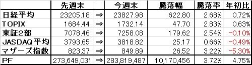 取引・なしPF(保有銘柄17銘柄)【現物】・2221 岩塚製菓×3,000株 (@3,758) 時価4,220△15 [PER12.1][PBR0.43]・3254 プレサンス×20,000株 (@1,070) 時価1,345△48 [PER3.9][PBR0.78]・3504 丸八HD×33,500株 (@767) 時価797±0 [PER21.2][PBR0.27]・3537 昭栄薬品×6,000株 (@567) 時価1,119△3 [PER17.2][PBR0.51]・4365 松本油脂製薬×1,000株 (@10,508) 時価12,900△600 [PER10.7][PBR0.78]・5444 大和工業×4,000株 (@2,662→2,583) 時価2,619▼41 [PER12.5][PBR0.56]・6362 石井鐵工所×6,500株 (@2,303) 時価2,829△10 [PER17.4][PBR0.35*]・6396 宇野澤組鐵工所×3,000株 (@2,126) 時価3,680△50 [PER101.7][PBR0.38*]・7485 岡谷鋼機×1,000株 (@9,370) 時価9,990△60 [PER6.0][PBR0.44]・7932 ニッピ×3,000株 (@3,987→2,929) 時価4,200▼75 [PER9.7][PBR0.30*]・8293 ATグループ×6,000株 (@1,764) 時価1,793▼18 [PER7.5][PBR0.29]・8591 オリックス×10,000株 (@1,623→1,546) 時価1,940.0▼9.0 [PER8.3][PBR0.82] ・9022 東海旅客鉄道×1,000株 (@22,181→20,505) 時価22,155▼200 [PER10.2][PBR1.13]・9699 西尾レントオール×4,000株 (@2,894) 時価3,015▼30 [PER8.5][PBR0.87]・9734 精養軒×10,000株 (@900) 時価1,179ケ [PER34.8][PBR0.41*]・9852 CBグループM×2,000株 (@2,403) 時価2,873▼7 [PER9.1][PBR0.31]・9984 ソフトバンクG×10,000株 (@3,935→3,569) 時価5,064.0△337.0 [PER8.7][PBR1.43] ※ほか株主優待目的で32銘柄保有【年間予想受取配当額】(税引前) 5,888,000-5,904,000円 (配当利回り2.10%)【年間受取確定配当額】(税引前) 0円株式 280,917,000円(99.0%)CP 2,902,487円(1.0%)合計 283,819,487円 ※1/22以来、年初来最高値更新!【年初来最高値】283,819,487円(2/7)◎【年初来最低値】269,311,412円(1/6)前日比 △4,347,000円週次 △10,170,456円月次 △10,170,456円年次 △12,871,475円(年初より△4.75%※配当含まず)☆今日のコメント☆「大幅に4日続伸で年初来最高値更新へ!」【保有銘柄動向】 日経平均株価は4日ぶりに小反落。保有銘柄はソフトバンクGが大幅高がPFを牽引。プレサンス、松本油脂製薬なども堅調だった。反面、ニッピ、大和工業、JR東海、西尾レントなどは軟調も、PFは大幅に4日続伸となり、年初来最高値更新へ!【今日の売買】 なし【今日の一言】 ソフトバンクGの大幅高が貢献しPFは年初来高値更新となり、月次+1000万円突破と急伸。来週以降の反動に留意。☆今週のコメント☆「大幅反発」 今週は+10,170,456円(+4.75%)と大幅反発となった。指数も軒並み反発と堅調。今週は三井不動産を売り切り、西尾レントオールを新規買い。大和工業、ソフトバンクGを買い増しへ。保有銘柄はソフトバンクG、オリックス、松本油脂製薬、プレサンス、JR東海などがPFを牽引した。 来週は先物価格が軟調な事から月曜日は下落して始まりそう。決算発表もピークアウトするので、今週と同様により良い銘柄があれば入れ替えつつ、より強いPF作りをして行きたい。※PBRの後ろに*表記がある銘柄は、賃貸用不動産等の含み益を加味した税引前の実質PBRの数値です。※取得単価に→があるものは、節税クロス前の単価→節税クロス後の単価となります。※当ブログに掲載されているコメントは、あくまで個人的見解に基づくものであり、特定銘柄への投資を推奨するものではありません。また当ブログに書かれている事は100%正確であるとは限りません。くれぐれも投資は自己責任でお願い致します。