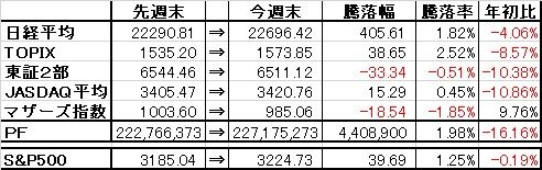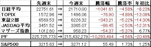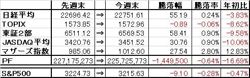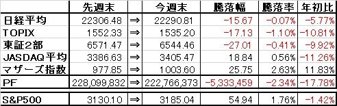 取引・なしPF(保有銘柄21銘柄)【現物】・2221 岩塚製菓×3,000株 (@3,762→3,456) 時価3,680▼5 [PER12.9][PBR0.39]・3001 片倉工業×10,000株 (@1,253) 時価1,080▼30 [PER17.9][PBR0.24*]・3447 信和×7,000株 (@724) 時価697▼7 [PER12.3][PBR0.71]・3504 丸八HD×32,400株 (@745→623) 時価642▼1 [PER33.1][PBR0.22]・3537 昭栄薬品×6,000株 (@567) 時価955▼1 [PER18.4][PBR0.41]・4659 エイジス×3,000株 (@1,951) 時価2,371△11 [PER7.6][PBR1.20]・6222 島精機製作所×6,000株 (@1,396) 時価1,395▼37 [PER-][PBR0.45]・6396 宇野澤組鐵工所×2,500株 (@2,119) 時価2,265△37 [PER248.9][PBR0.20*]・7453 良品計画×5,000株 (@1,146) 時価1,418▼8 [PER-][PBR1.93]・7485 岡谷鋼機×1,000株 (@9,376→7,752) 時価8,400- [PER5.4][PBR0.39]・7932 ニッピ×2,000株 (@3,987→2,929) 時価3,460△15 [PER2.3][PBR0.23*]・8293 ATグループ×8,000株 (@1,646) 時価1,305△7 [PER9.6][PBR0.21]・8591 オリックス×8,500株 (@1,524→1,440) 時価1,272.5▼10.5 [PER8.4][PBR0.53] ・8595 ジャフコ×2,000株 (@2,694) 時価3,860△10 [PER13.9][PBR0.63] ・8802 三菱地所×14,000株 (@1,791) 時価1,623.5▼22.0 [PER19.0][PBR0.36*]・9020 東日本旅客鉄道×1,000株 (@7,403) 時価7,294▼68 [PER45.9][PBR0.59*]・9022 東海旅客鉄道×1,000株 (@20,917→17,943) 時価15,430▼195 [PER19.7][PBR0.79]・9699 西尾レントオール×4,000株 (@2,894→2,772) 時価2,230▼52 [PER10.9][PBR0.62]・9734 精養軒×10,000株 (@901→826) 時価780△5 [PER-][PBR0.27*]・9793 ダイセキ×3,000株 (@1,866) 時価2,454▼89 [PER19.0][PBR1.50]・9984 ソフトバンクG×2,000株 (-) 時価6,415.0△12.0 [PER-][PBR0.51*] ※ほか株主優待目的で33銘柄保有【年間予想受取配当額】(税引前) 4,369,000-4,712,000円 (配当利回り2.10-2.26%)【年間受取確定配当額】(税引前) 3,167,050円株式 208,142,300円(91.6%)CP 19,032,973円(8.4%)合計 227,175,273円【年初来最高値】290,545,487円(2/12)【年初来最低値】186,752,552円(3/19)前日比 ▼1,624,150円週次 △4,408,900円月次 ▼5,517,085円年次 ▼43,772,739円+配当3,147,050円(年初より▼16.16%※配当含まず)☆今日のコメント☆「3日ぶりに反落」【保有銘柄動向】 日経平均株価は続落。保有銘柄も軟調な銘柄が多く、オリックス、JR東海、JR東日本、三菱地所などの大型株やダイセキ、西尾レントオール、島精機、片倉などを中心に軟調だった。PFは3日ぶりに反落へ。【今日の売買】 なし【今日の一言】 PFは3日ぶりに反落も、4週ぶりに週次プラスで終了に。☆今週のコメント☆「4週ふりに反発」 今週は+4,408,900円(+1.98%)と4週ぶりに反発となった。指数は-1.85~+2.52%とまちまち。TOPIXの堅調が目立った。今週は売買はなし。保有銘柄は三菱地所、ジャフコ、良品計画、ソフトバンクGが堅調だった。 来週も引き続き動きにくい展開が続きそう。PFの低迷を脱却するために抜本的な銘柄入れ替えも検討しつつタイミングを見極めて行きたい。※PBRの後ろに*表記がある銘柄は、賃貸用不動産等の含み益を加味した税引前の実質PBRの数値です。※取得単価に→があるものは、節税クロス前の単価→節税クロス後の単価となります。※当ブログに掲載されているコメントは、あくまで個人的見解に基づくものであり、特定銘柄への投資を推奨するものではありません。また当ブログに書かれている事は100%正確であるとは限りません。くれぐれも投資は自己責任でお願い致します。
